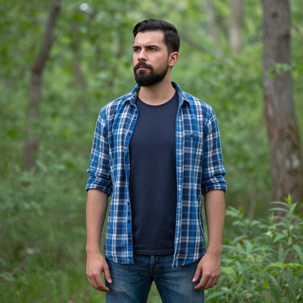 A man with a neatly trimmed beard and short black hair stands confidently in a lush green forest. He is wearing a blue plaid shirt over a dark t-shirt and jeans, appearing relaxed and contemplative amidst the natural surroundings.