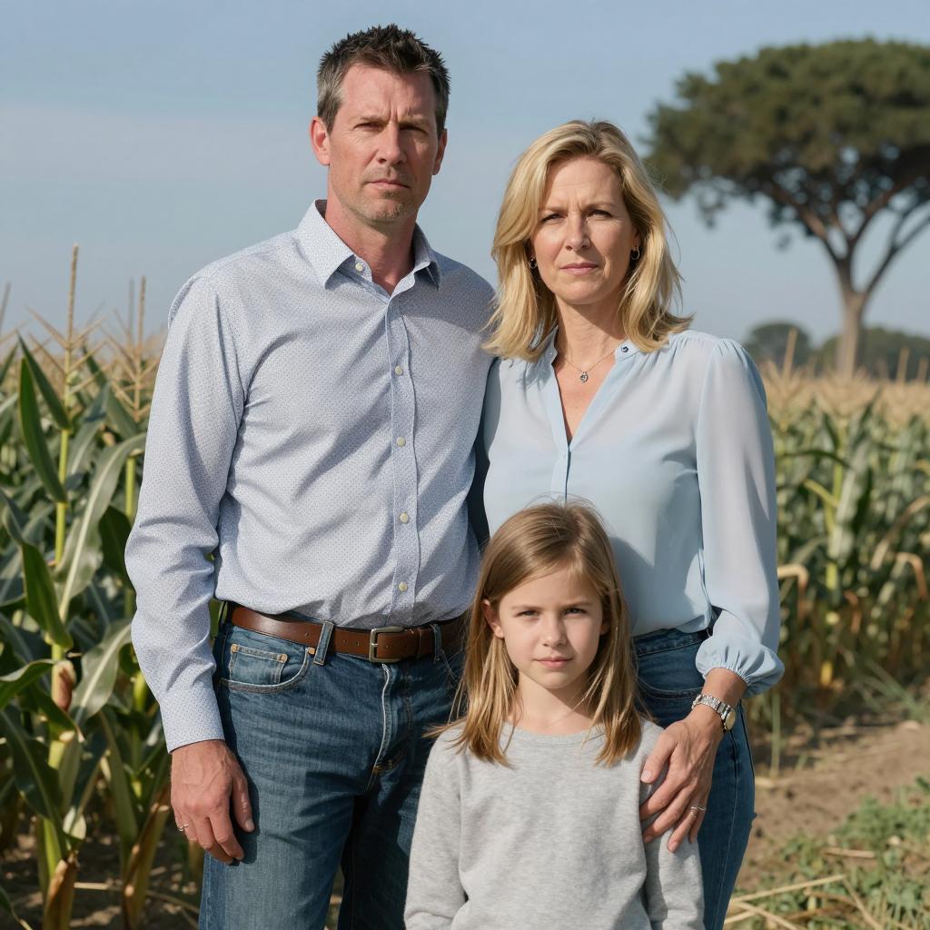 Family photograph. Father with short dark hair, light blue patterned shirt, and blue jeans stands to the left. Mother with shoulder-length blonde hair, light blue blouse, stands beside him. Young girl with light brown hair, wearing a gray sweater, kneels in front, holding mother's arm. Background: cornfield, blue sky, tall tree on the right. Father's expression is serious, mother's neutral, girl's expression calm. All three people stand close together.