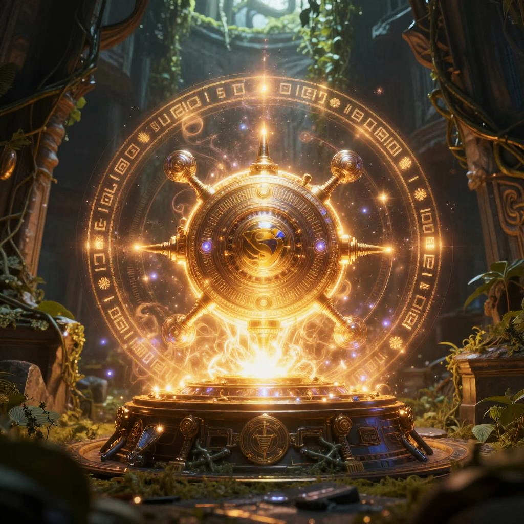 Super hero power generator surrounded by floating mystical runes and ethereal energy, ancient enchanted device glowing with golden light, overgrown ruins with vines and magical aura, dramatic contrast of nature and technology, fantasy theme