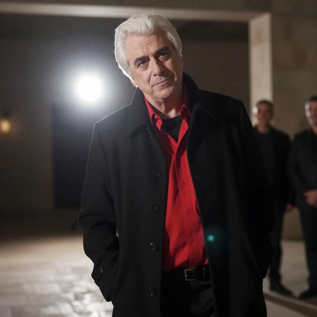 Portrait of an older Caucasian man with gray hair wearing a black suit, white shirt, and dark tie standing in a dimly lit blue-tinted stone room. He has a serious expression and is pointing forward with his right hand. The background features stone pillars and a window casting soft light and shadows.