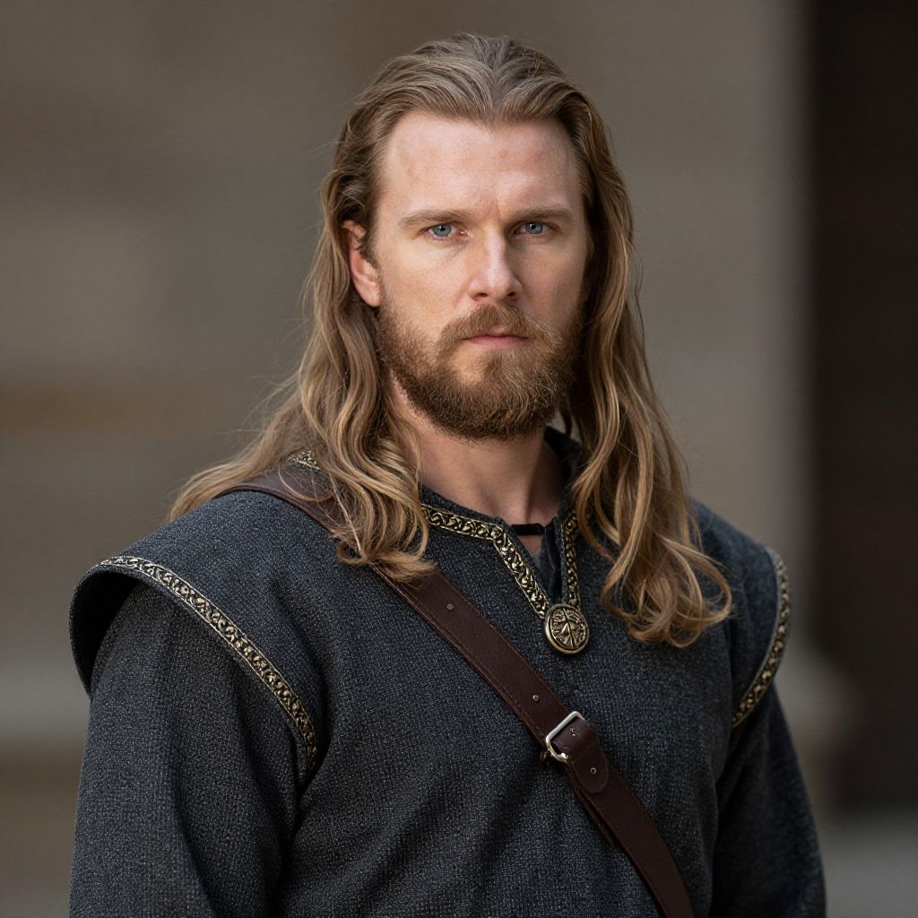 A man with long blonde hair and a beard is wearing a medieval costume.