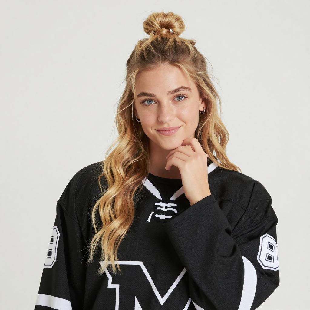 Photograph of a young woman with long, wavy, blonde hair in a top knot, wearing a black and white hockey jersey. She is smiling slightly, with her right hand touching her chin. The background is plain white, highlighting her casual, relaxed pose and stylish appearance.