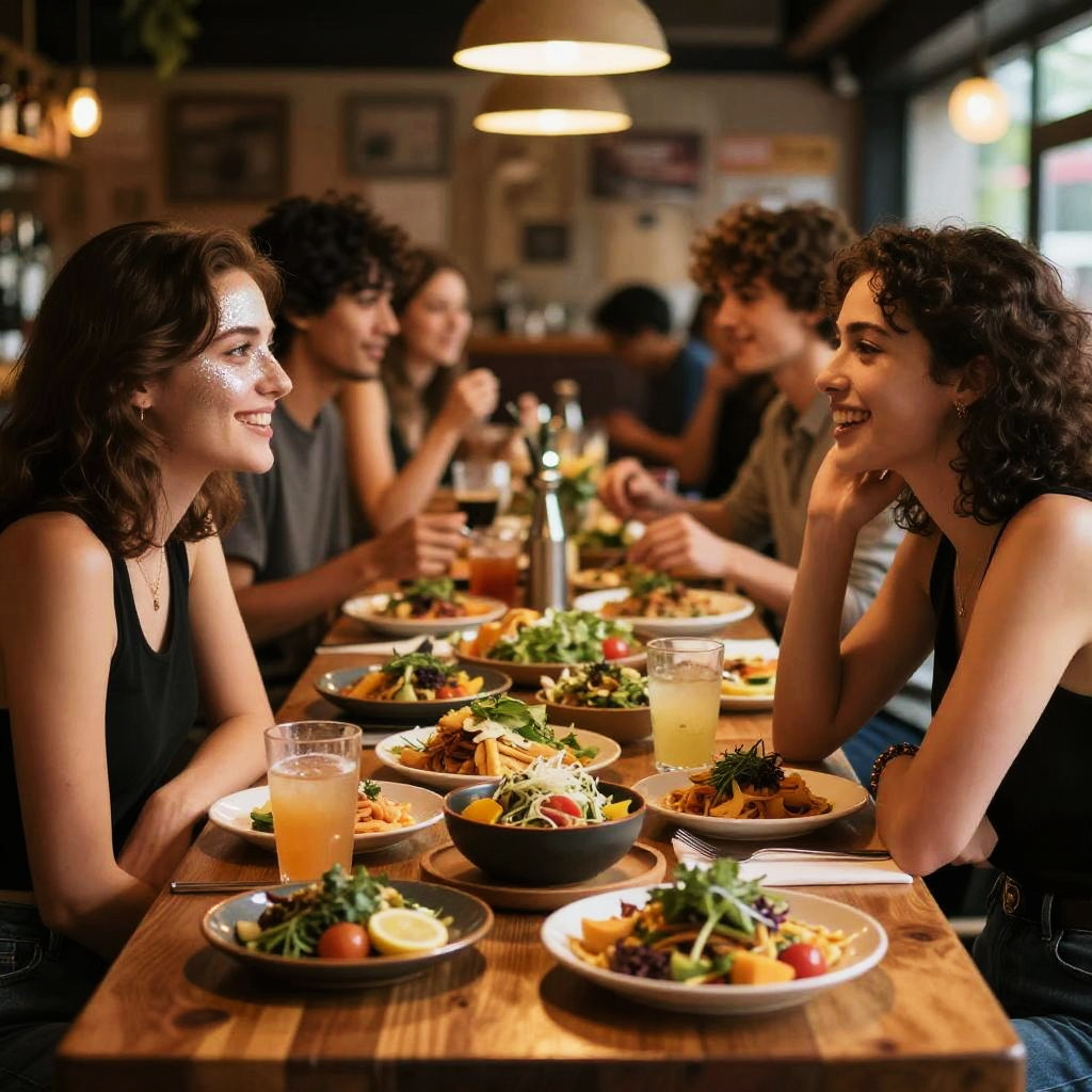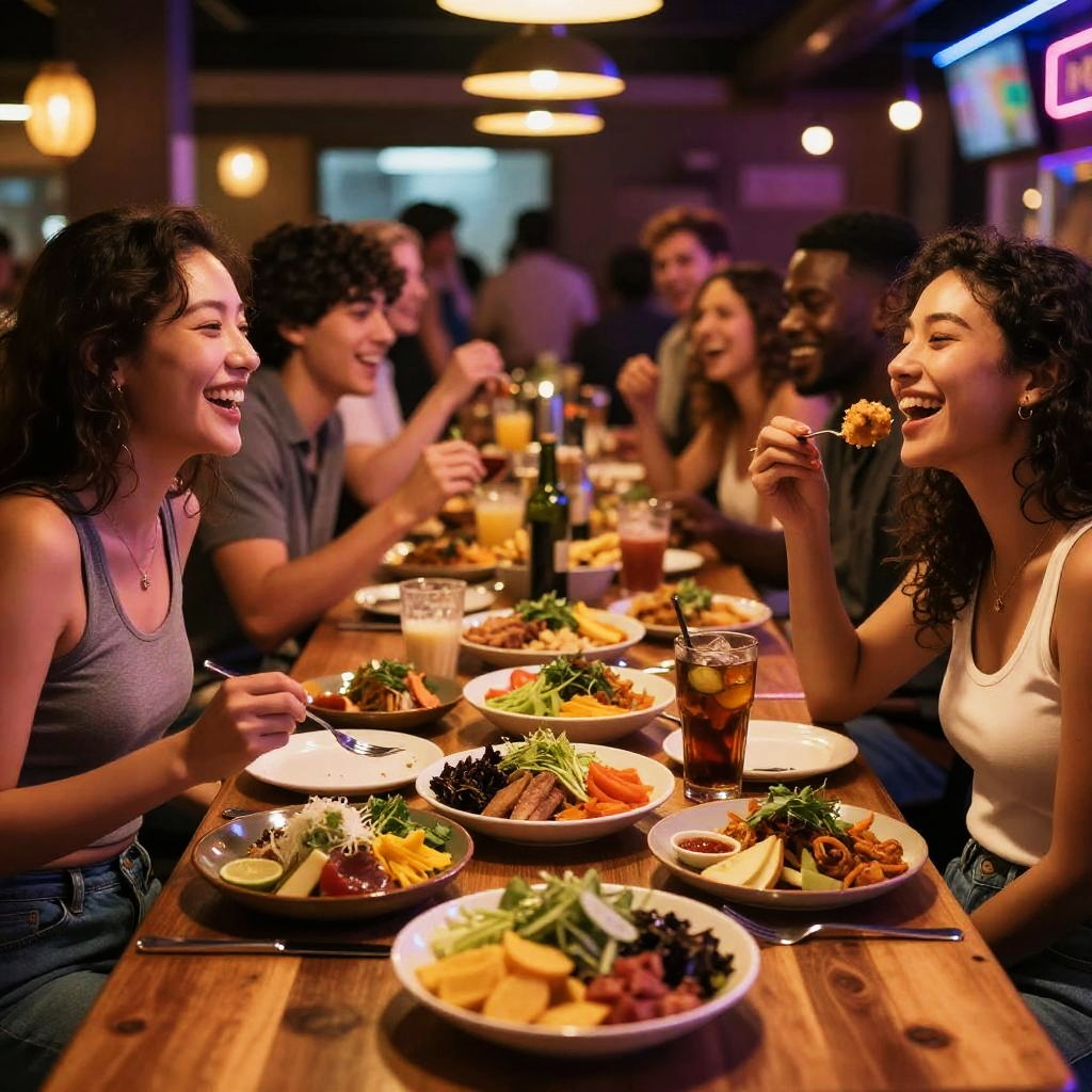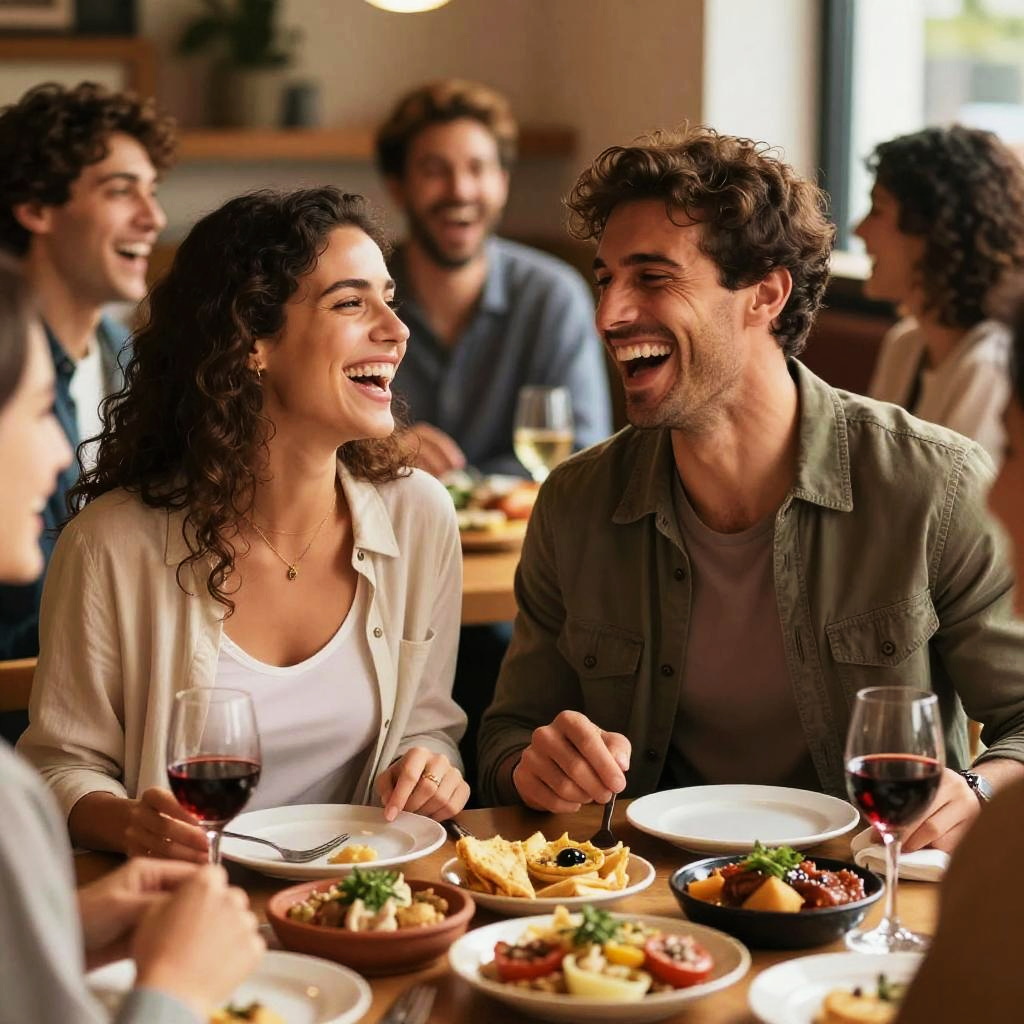 Fit woman and muscular man, fit, muscular, modern chic, casual jacket, natural warm, blurred animated crowd, laughing openly, fusion tapas, people laughing and enjoying themselves, diverse spread of food across the table, slightly blurred background, detailed expressions of joy, ultra-detailed, cozy and inviting scene for social gatherings