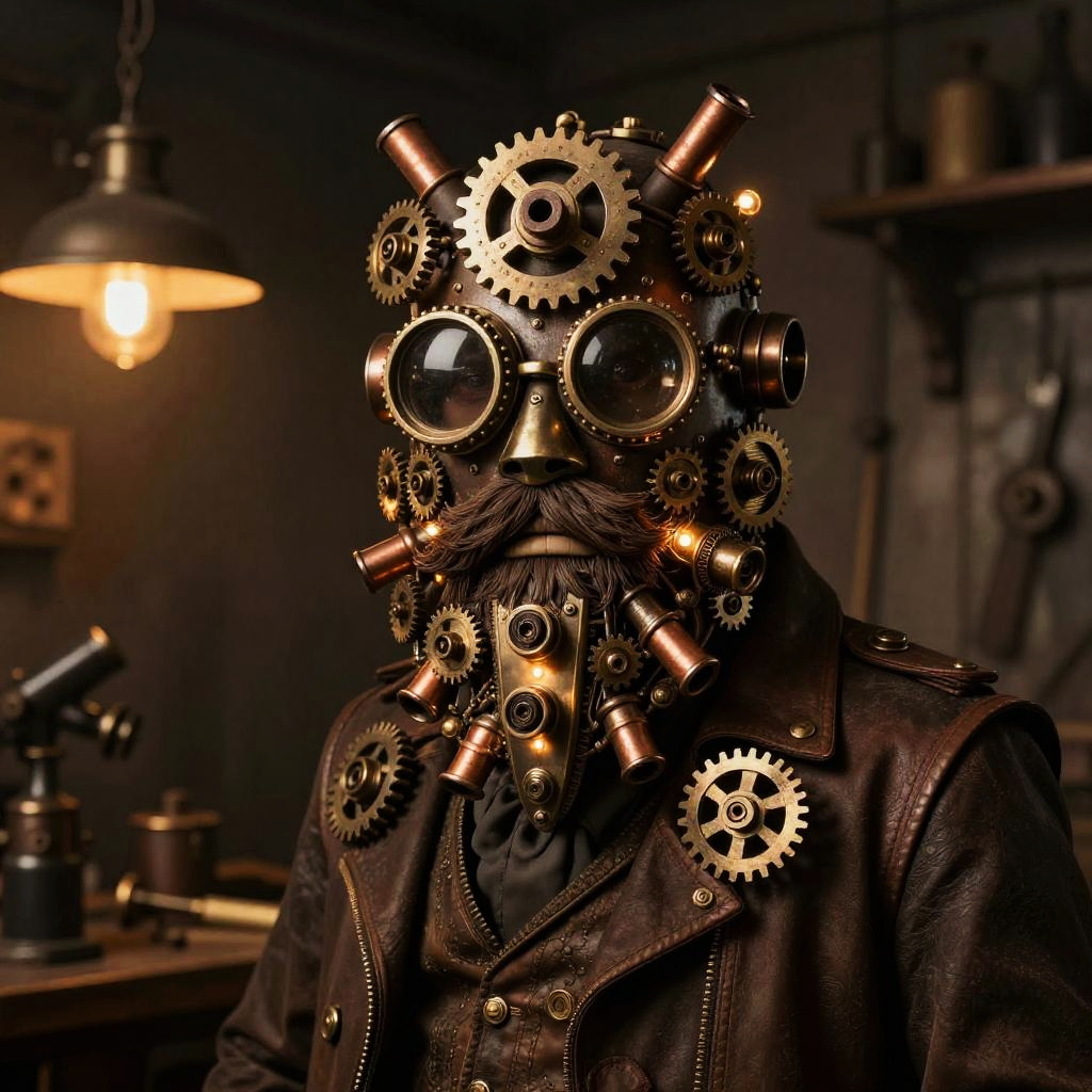 Beard costume resembling a steampunk inventor's beard with metallic gears, copper tubes, and tiny glowing lights, worn by a mysterious figure in a Victorian-inspired workshop, atmospheric, intricate detail, warm sepia tones.