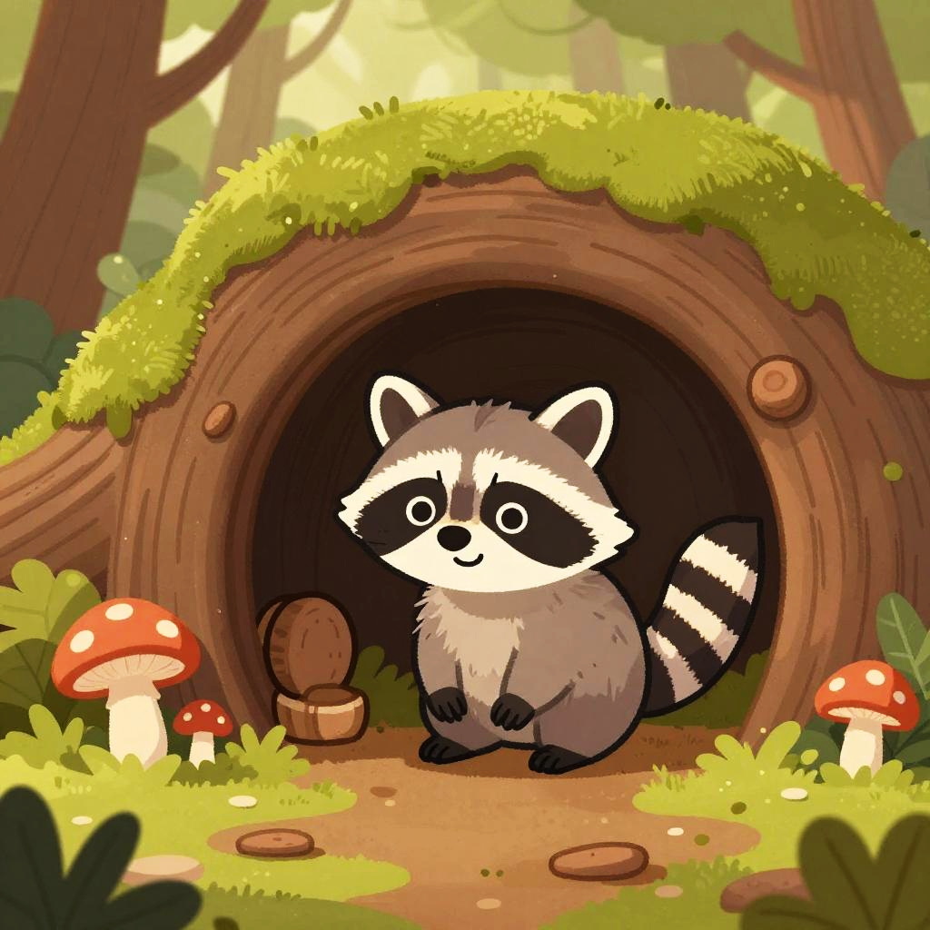 A whimsical and cute illustration featuring a curious raccoon holding a glowing lantern in a nighttime forest, using a cool color palette with clean, smooth lines. The background includes silhouetted trees, scattered fireflies, and a star-speckled sky, creating a charming and inviting scene. The style is lighthearted and playful, with a focus on simplicity and warmth, capturing a cozy, feel-good atmosphere.