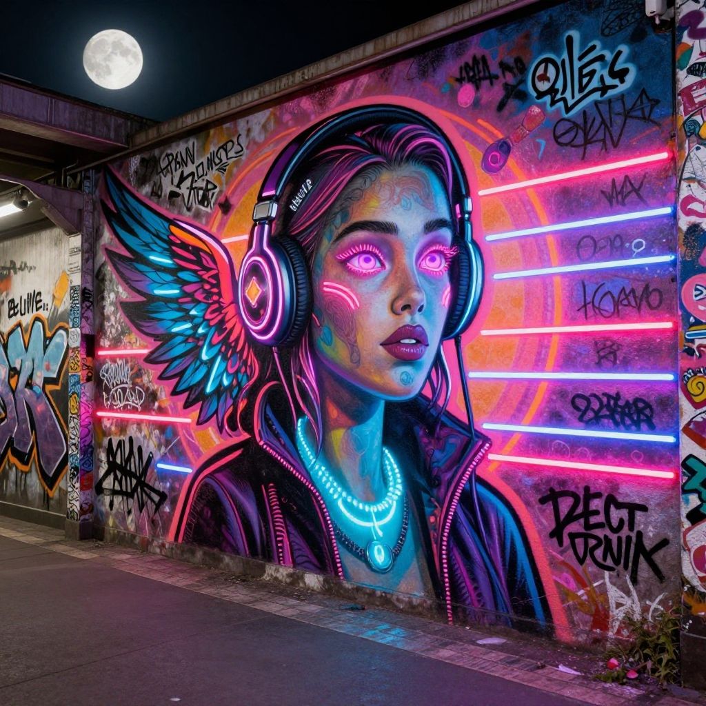 (Style: realism, (epic:1.2), realistic, photo, trending on artstation, (pixar), 3d, ((high quality:1.2, masterpiece:1.2)), (8k resolution), high details, incredibly absurdres, color connection, colorized, colorful), ((undergound station:1.35)), ((best quality)), ((detailed)), ((masterpiece)), ((dark, night, moonlight:1.3)), ((Enchanting)), Phenomenal, Exquisite, (((wall (graffiti:1.2) portrait) of (neonpunkai woman:1.2), (Wall Graffiti:1.3), headphones, feathered wings, (Graffiti:1.2))) (neon stripes:1.1), neon background, (glowing:1.3)(bioluminescence:1.2), artwork, (flat shading:1.1), (influenced by banksy:1.3), Panoramic view, Wide angle, (lineart:1.1), thick lines, (clear lines:1.18), (detailed eyes:1.2)