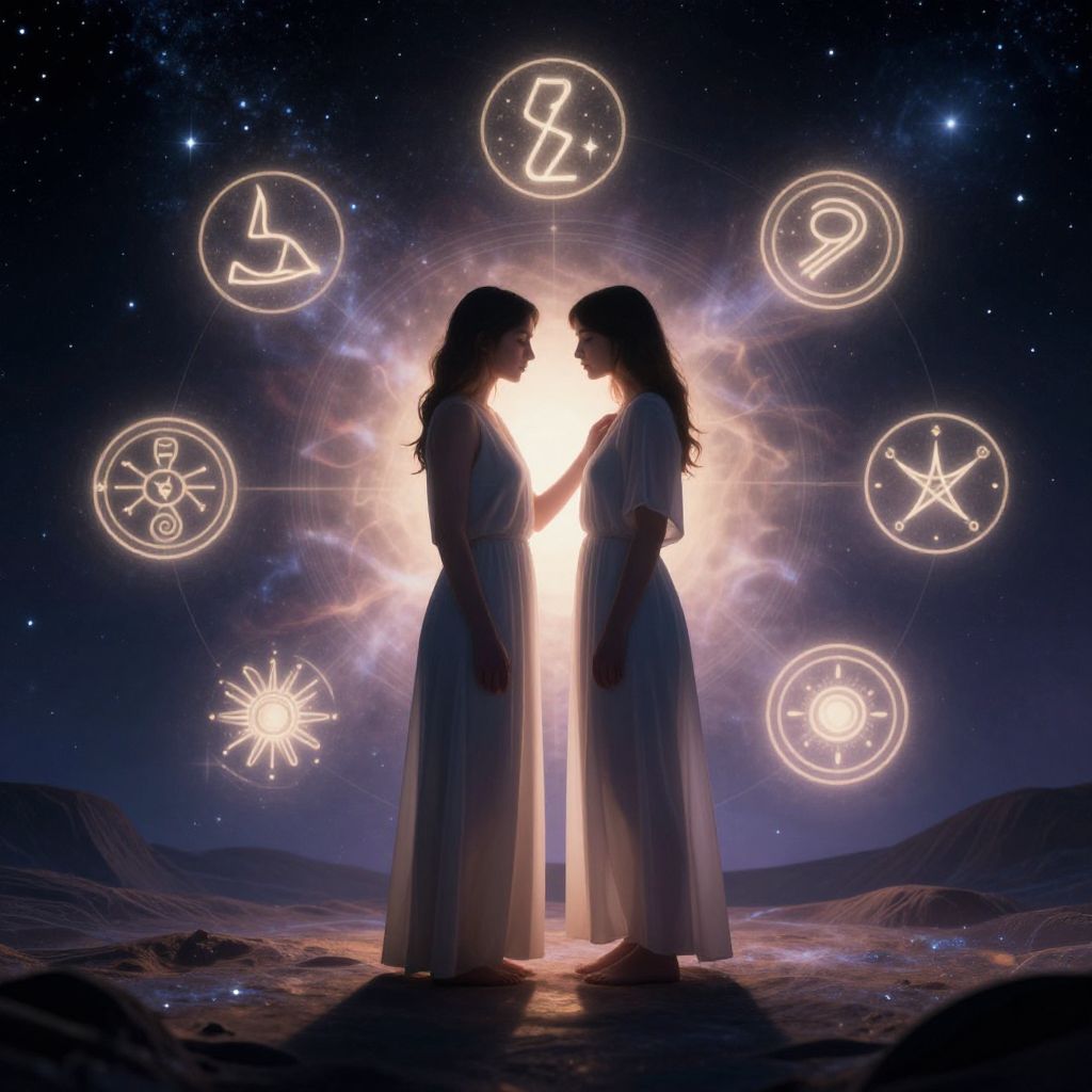 Sag man and cancer woman standing together in a surreal cosmic landscape, zodiac symbols glowing softly around them, ethereal light casting shadows, mystical atmosphere, celestial stars sparkling in the background, emotional connection expressed through body language.