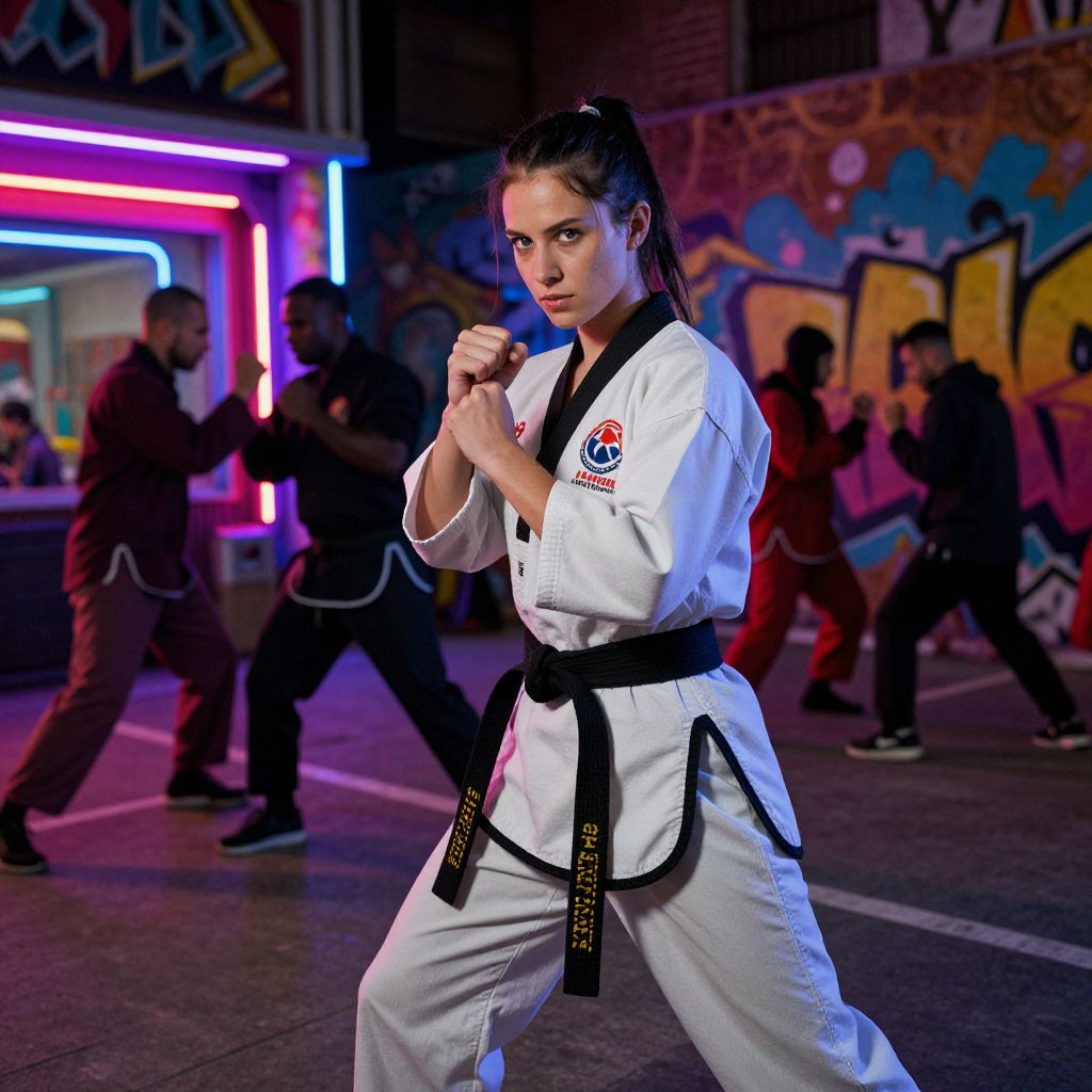 Photograph of a determined young woman in a white martial arts gi with black belt, executing a karate stance in a neon-lit, graffiti-covered