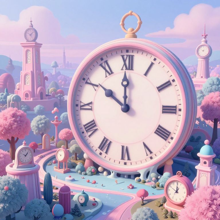 Digital illustration in a whimsical, pastel-colored style. A gigantic, pink-framed clock with black Roman numerals and black hands dominates the center, towering over a miniature, fantastical garden city. The background features pink and blue towers with clock faces, and trees with pink and blue foliage. Smaller clocks are scattered throughout the garden, including one on the bottom right. A winding blue pathway curves through the scene, leading to a distant castle. The sky is a vibrant blue with fluffy white clouds, enhancing the surreal, dreamlike atmosphere.