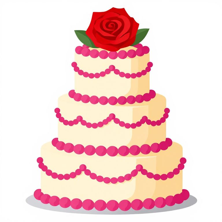 A vibrant vector illustration of a three-tiered wedding cake adorned with scalloped frosting, pink bead decorations, and a striking red rose atop, rendered in a clean, digital art style with transparent background.