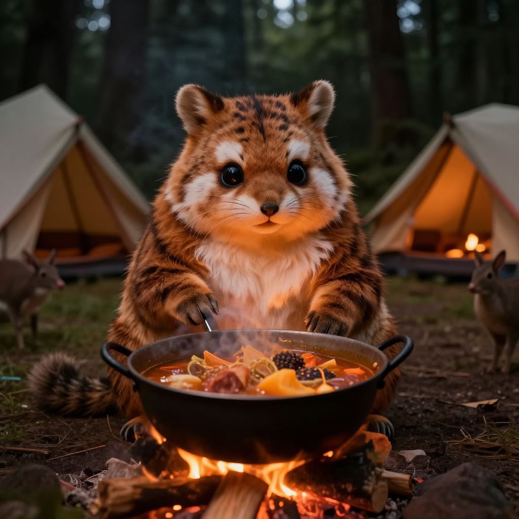Photorealistic digital artwork of an adorable, wide-eyed, fluffy raccoon cub cooking in a pot over a campfire, surrounded by tents in a