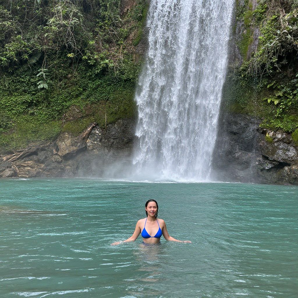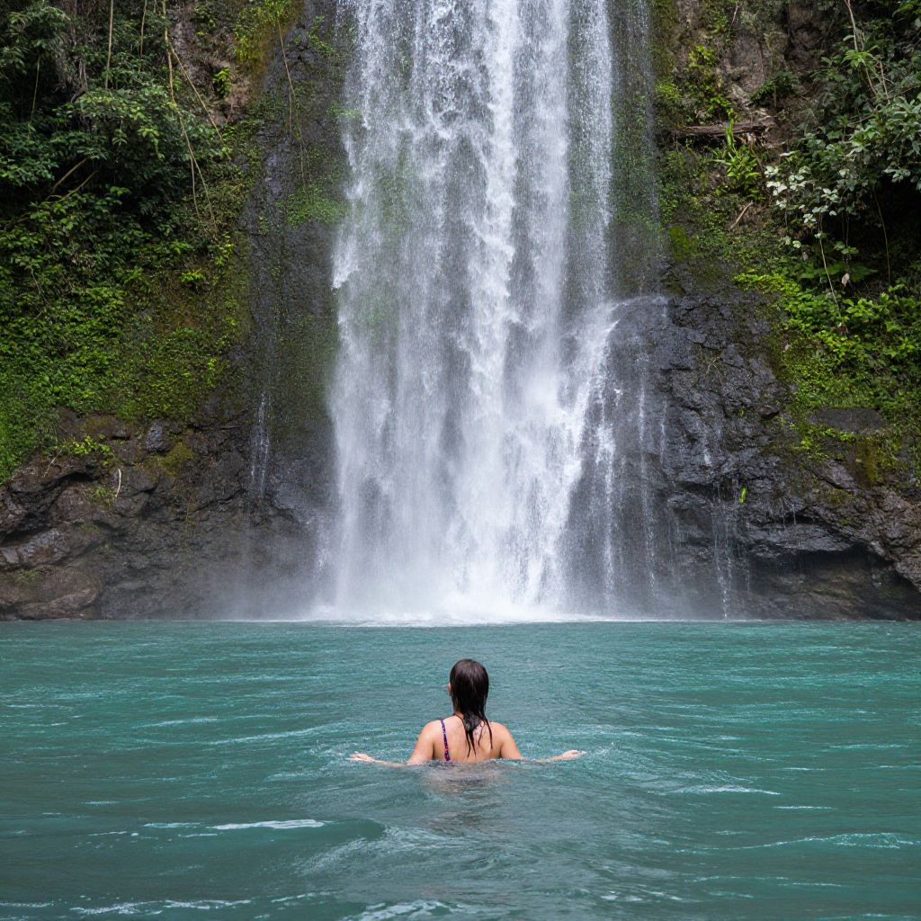 Photograph of a person with wet, black hair swimming in a turquoise pool, facing a cascading waterfall. The person, wearing a black bikini, is partially submerged, with only their upper back and shoulders visible. The waterfall, located at the center background, plunges down a dark rock cliff covered in lush green foliage. White water contrasts sharply with the dark rocks and greenery, creating a vivid, natural scene. The pool's clear water reflects the light, adding to the overall brightness of the image. The atmosphere is serene and tropical.