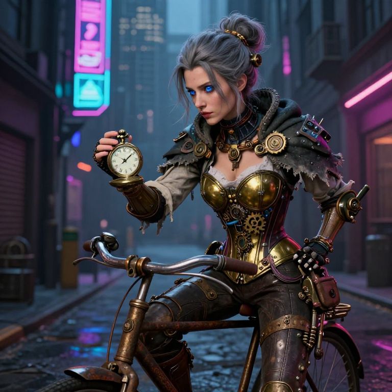 A super-realistic portrait depicts a time-traveling scientist with docile blue eyes and gray hair styled in a messy bun, seamlessly blending steampunk and cyberpunk aesthetics. Seated on an old rusty bicycle amidst a neon-lit alley, her focused expression conveys determination as she examines an antique pocket watch. Captured from above, the scene showcases intricate details of her retro-futuristic attire: an ornate brass corset adorned with gears and circuits integrated into her bodice, paired with a tattered cloak embellished with futuristic tech accents. The dimly lit background features towering skyscrapers and holographic advertisements casting surreal shadows that emphasize her dynamic pose as she reaches for the watch, ready to embark on another temporal journey.