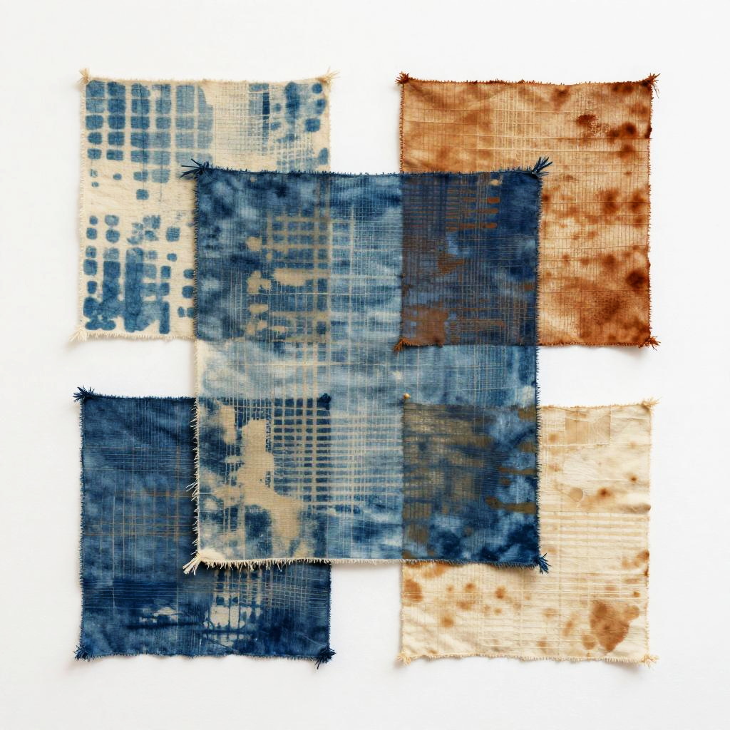 Explore Andean textile traditions through an innovative blend of handmade textile collage with layered silkscreen textures elements. Utilize a muted color scheme set against a bright white backdrop to create a minimalist aesthetic. Integrate faded indigo and sunburnt sienna accents through mixed media artistry, emphasizing painterly effects.