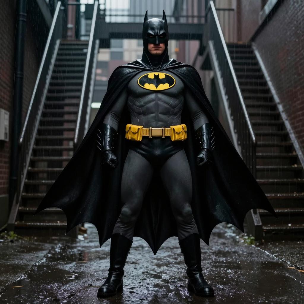 Three superheroes in dark, metallic costumes stand in a low-light setting. The woman on the left has long blonde hair and a black mask. The man in the center is Bat-Man with pointed ears and a stern expression. The man on the right has a similar mask and a muscular build. The background includes industrial structures and red and blue lighting. All three wear black capes. The man in the center is taller than the others.