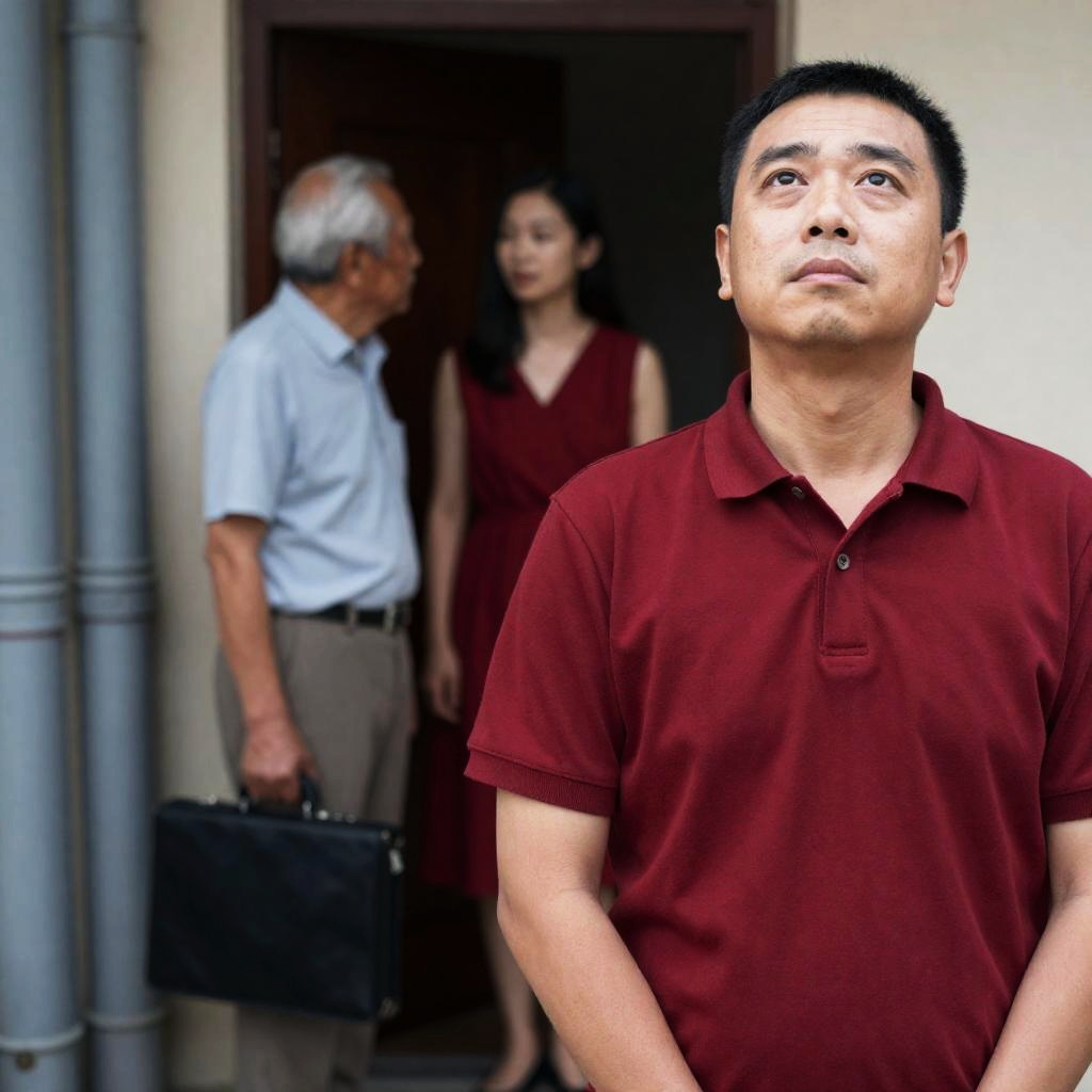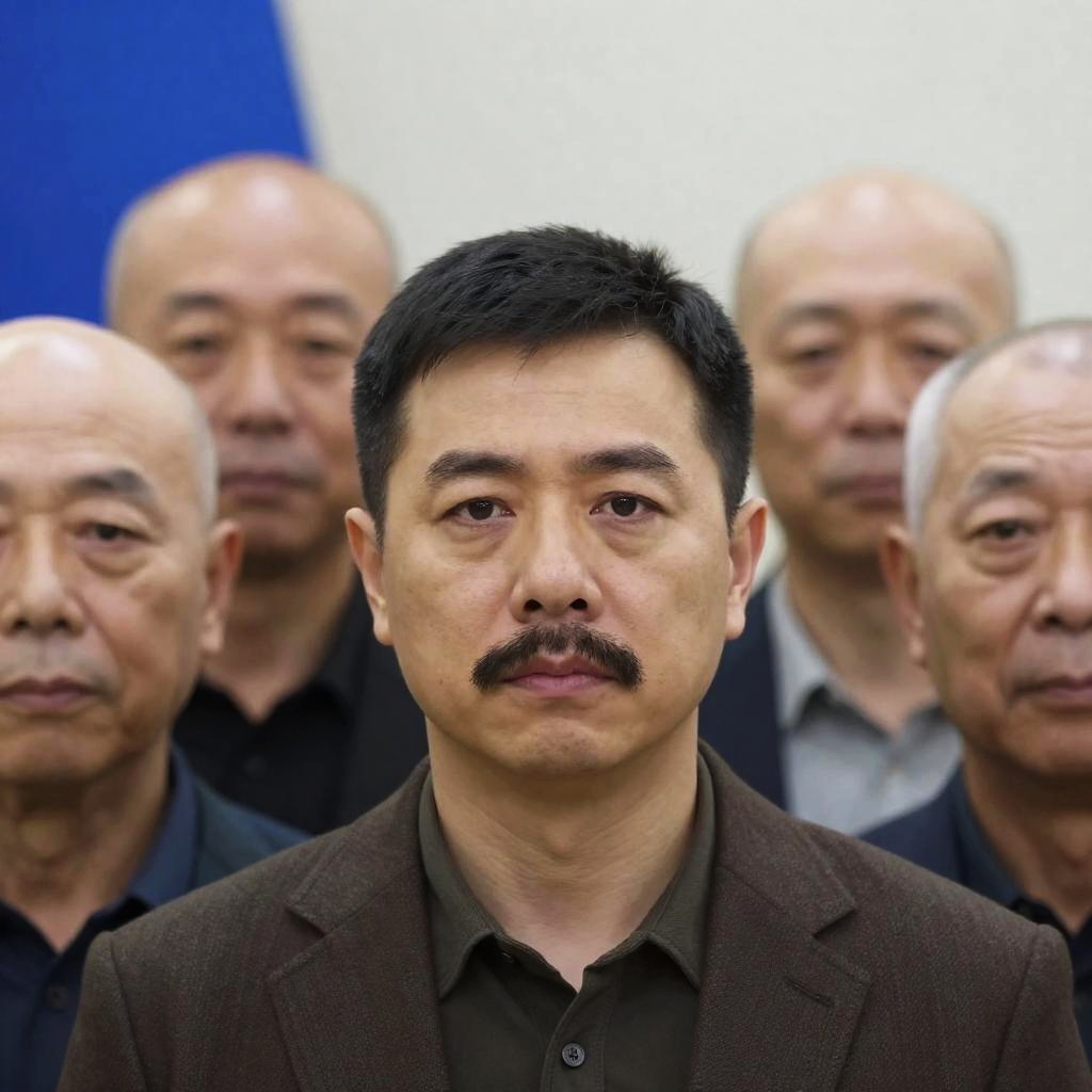 Photograph of a man with short black hair, wearing a brown jacket over a striped shirt, walking in a parade. Red banner with white behind him, blue sky, buildings in background. Multiple people, some holding flags, in the background.