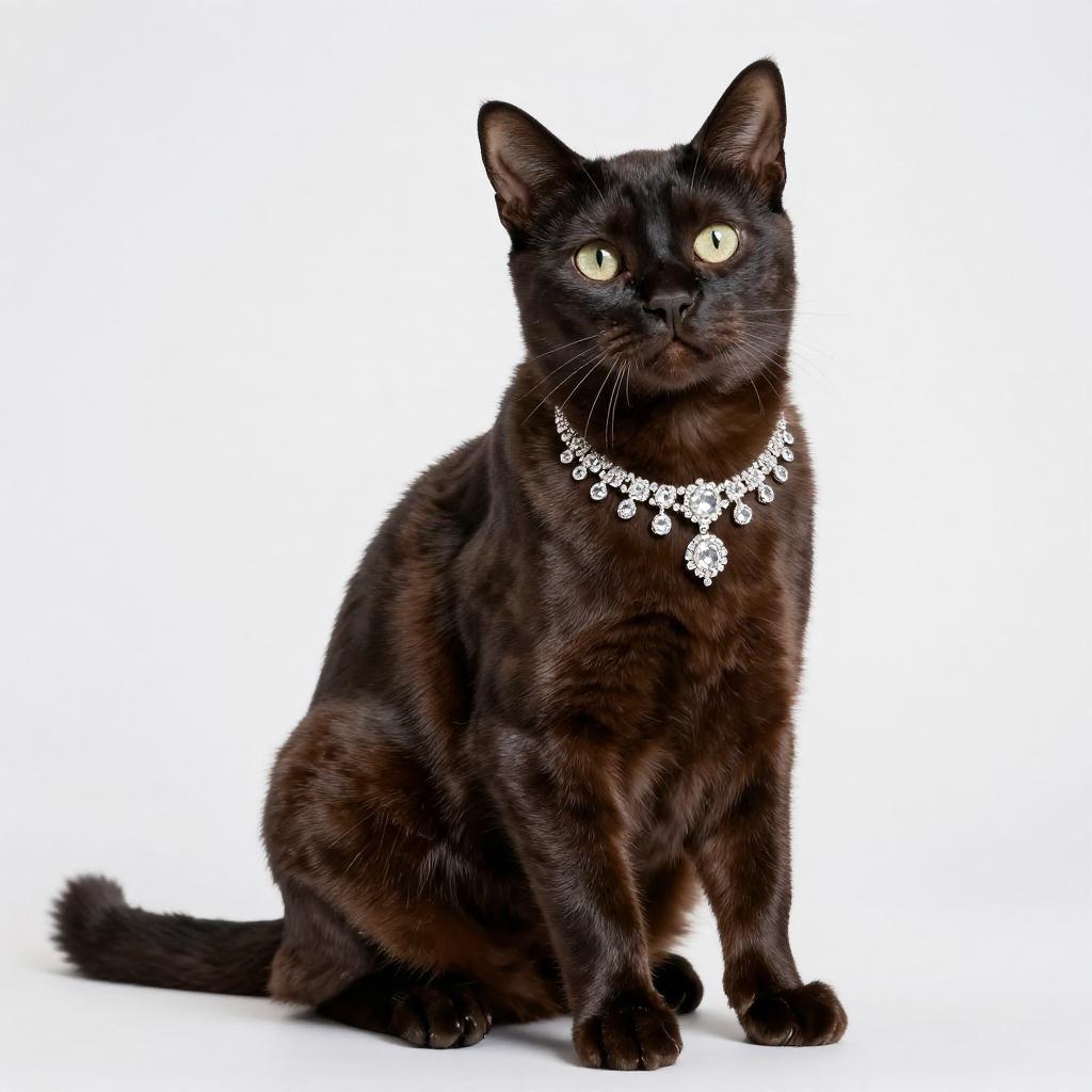 Luxurious studio portrait of a Exotic Shorthair cat sitting upright, glossy dark fur, wearing an ornate sparkling diamond necklace, clean white background, high-end fashion pet photography, high resolution, ultra-detailed