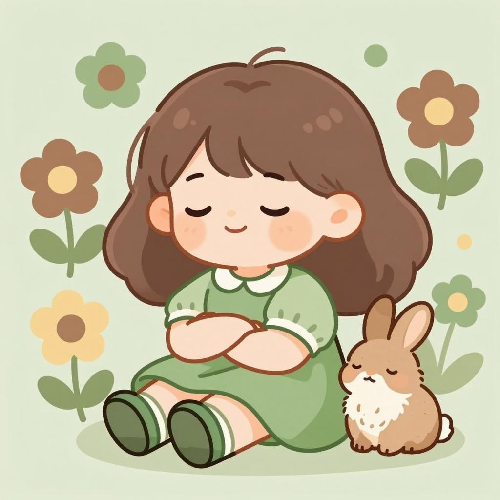 Illustration of a cute, chubby girl with large, fluffy brown hair, green dress, and green shoes, sitting with crossed legs. A small brown rabbit with white fur sits next to her. Floral, ured background with green, brown, and yellow flowers. Girl has closed eyes and a content smile. Rabbit has closed eyes and a relaxed expression.