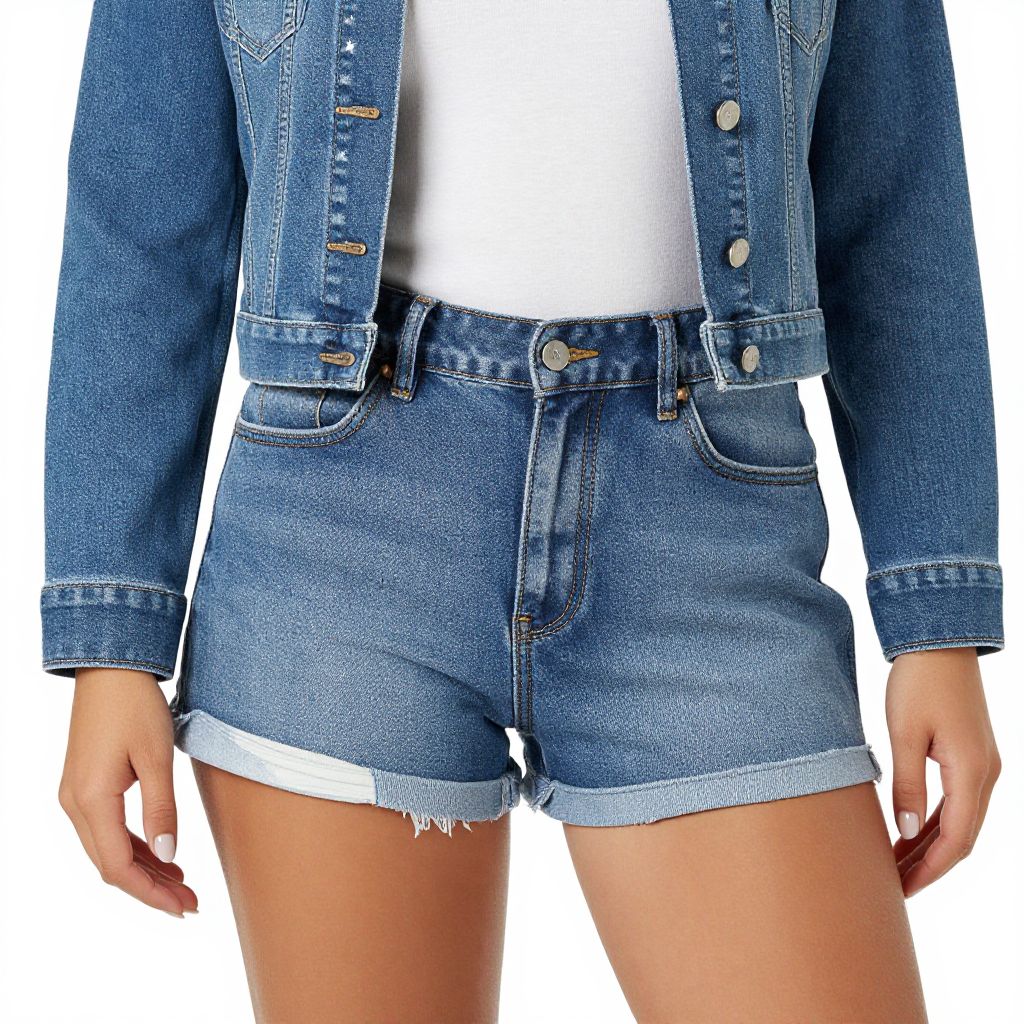 Photograph of a person wearing a blue denim jacket with silver buttons over a white t-shirt and high-waisted, frayed denim shorts.