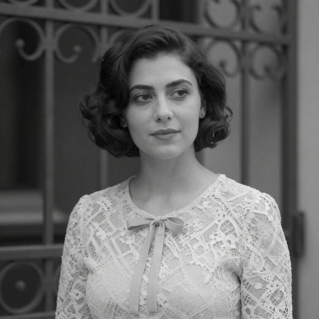 Black and white photograph of a woman with short, curly hair holding a vintage telephone to her ear. She wears a dark, satin robe with a light collar. Her expression is focused. Background is ured and dark.