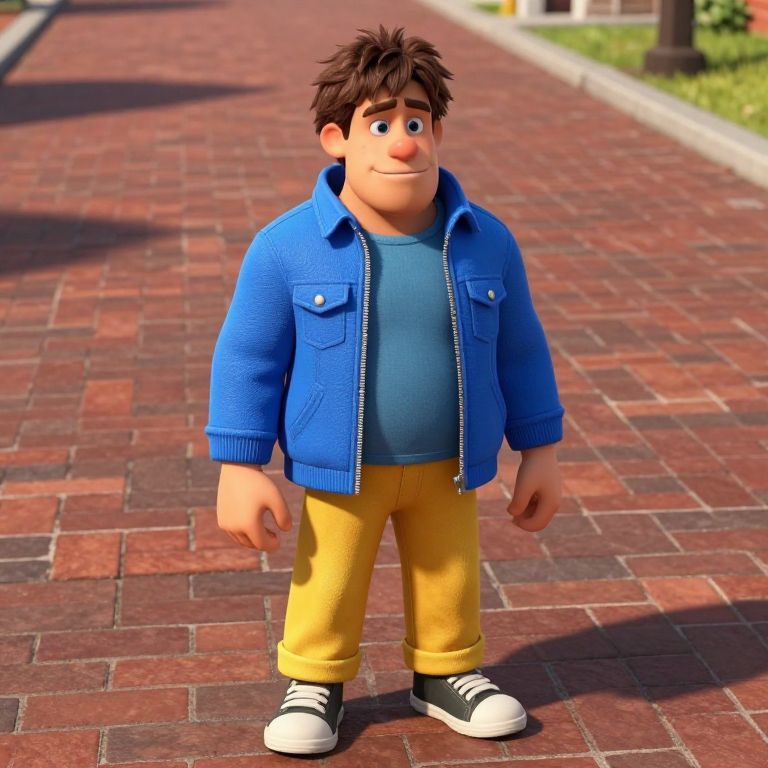 A CGI image of a chubby, young boy with short, spiky brown hair, standing on a brick pathway. He wears a bright blue, zip-up jacket with two chest pockets, a teal t-shirt, yellow pants, and black and white sneakers. His expression is neutral, with slightly raised eyebrows and a subtle smile. The background shows blurred greenery and a lamp post on the right, with sunlight casting shadows on the path. The boy's skin tone is light, and the overall style is cartoonish with smooth textures and vibrant colors.