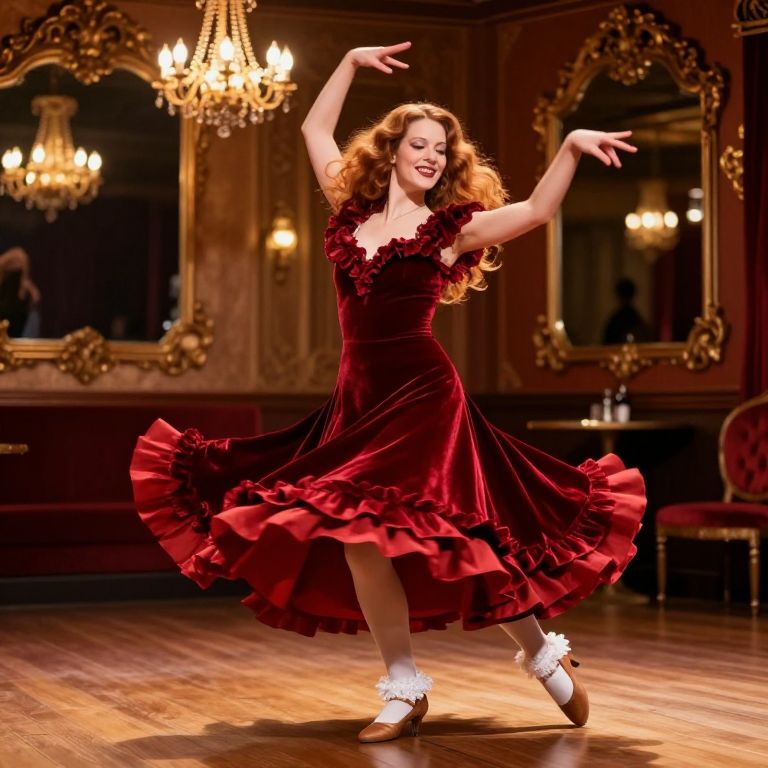 A confident French can-can dancer with long wavy chestnut hair and a mischievous smirk, wearing a deep red velvet dress with voluminous frills and matching frilled white stockings, spinning mid-performance on a polished wooden stage in a 1930s-style French salon with ornate mirrors and chandeliers, full of playful motion and theatrical flair.