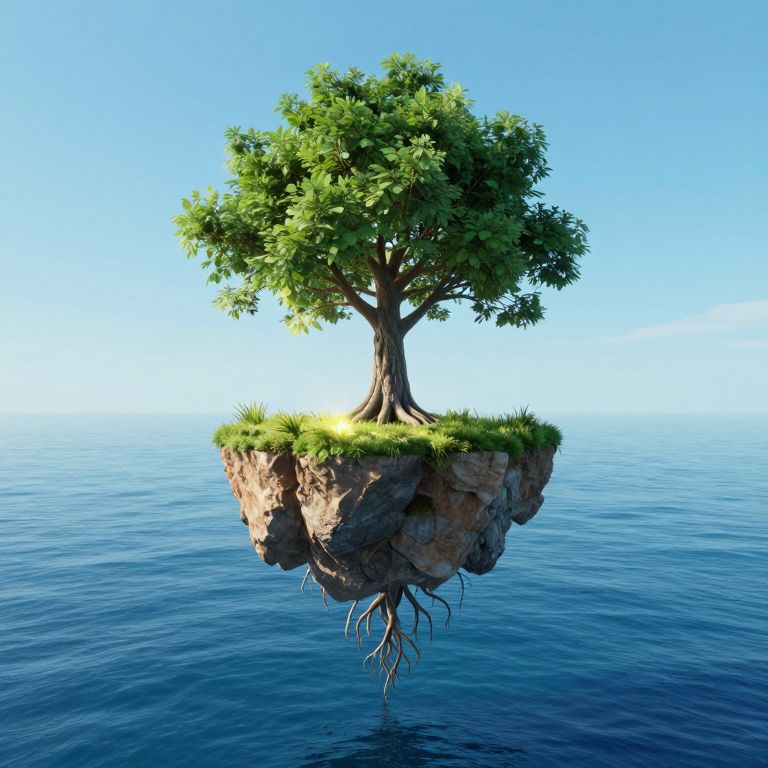 Digital artwork of a lush, green tree floating on a rocky island above calm, blue ocean water under a clear sky.