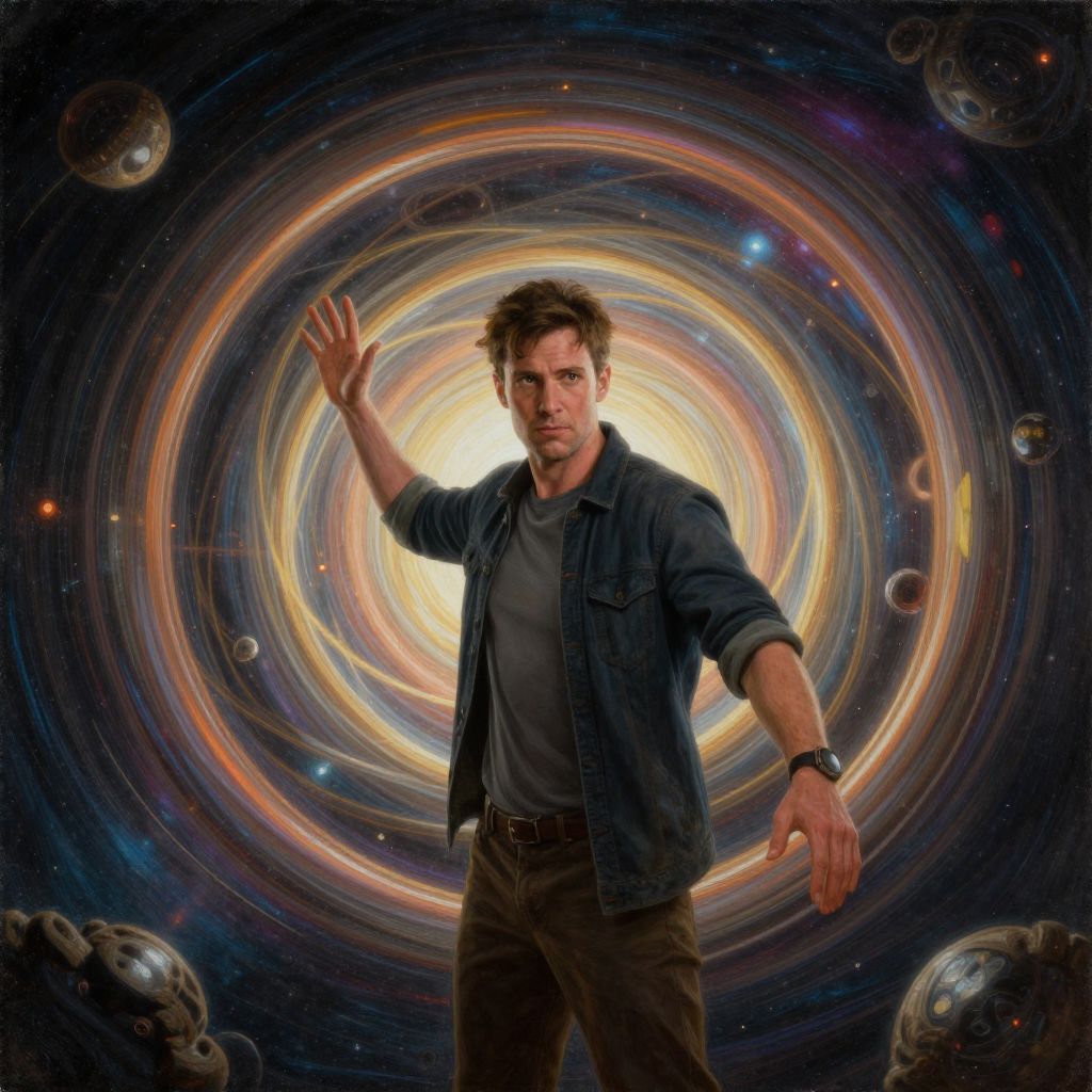 Photograph-like digital artwork of a white man with short brown hair and a slight beard, wearing a dark blue denim shirt over a gray t-shirt and brown pants. He stands in the center, right hand raised, left hand slightly extended. The background features a vibrant, swirling galaxy with concentric circles of yellow, orange, and blue light, surrounded by dark space with scattered planets and stars. The man's expression is serious and focused, and the image has a dynamic, cosmic feel. The colors are vivid, and the texture of the galaxy contrasts with the man's casual clothing.