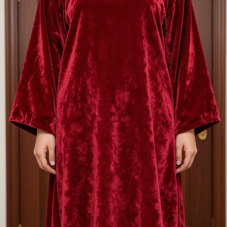 Photograph of a person wearing a rich, velvet red dress with long, flowing sleeves. The dress has a soft, plush texture, and the fabric appears luxurious. The person's hands, with light skin, rest by their sides. The background consists of a dark wooden door with a brass handle, slightly out of focus, highlighting the subject. The lighting is even, emphasizing the vibrant red color and velvety texture of the dress. The image focuses on the torso and arms, with no visible face or additional context.
