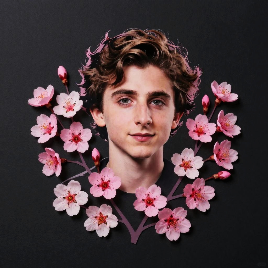 Realistic photo.Stencil art of Timothée Chalamet in the shape of blooming sakura on dark background, vivid colors, intricate and minimalistic. realistic photo