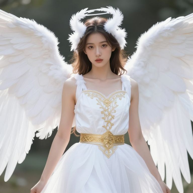 Female angel with white feathers on her head, wearing a white dress with gold embroidery and a gold belt.