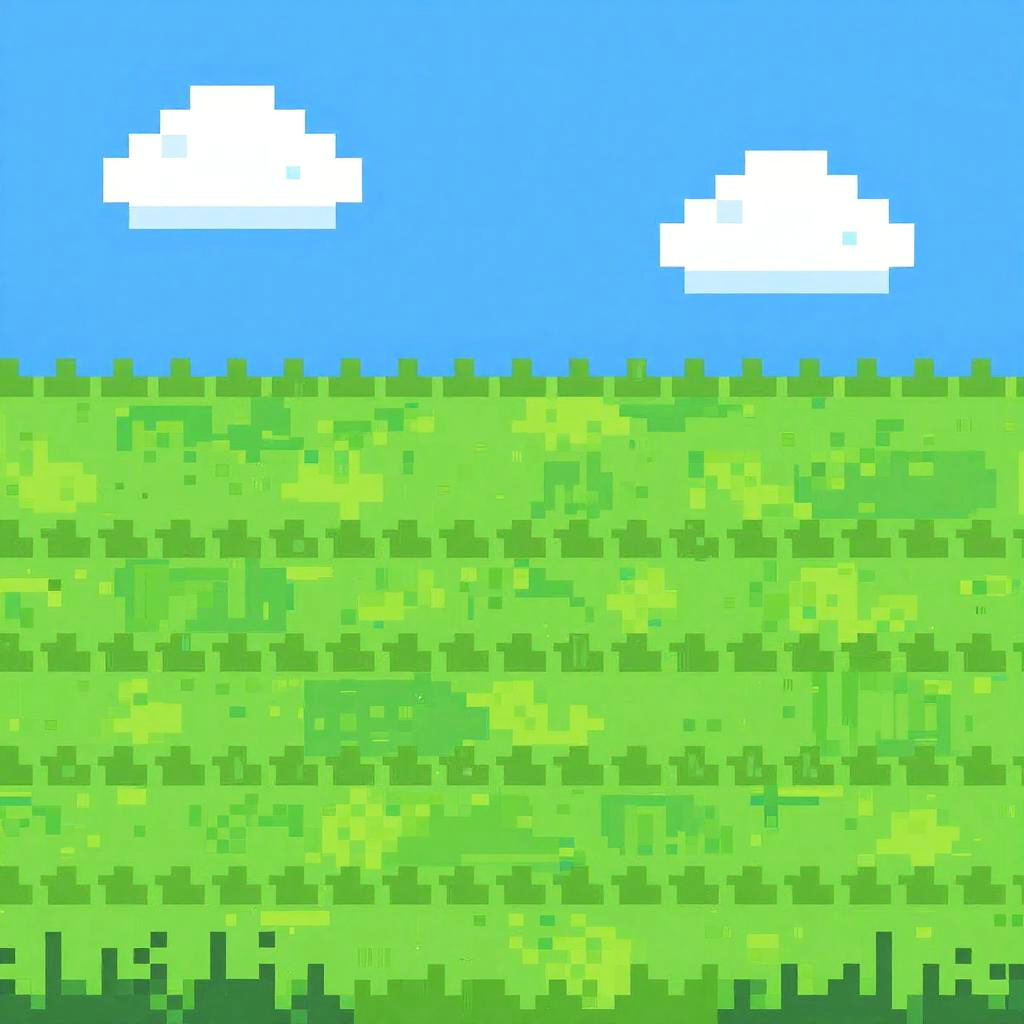 Video game grass on a vast battlefield terrain, dense and wild with varying shades of green, pixel art style with retro aesthetics, low-poly 3D look, immersive atmosphere with scattered flowers and small stones, afternoon light with soft shadows