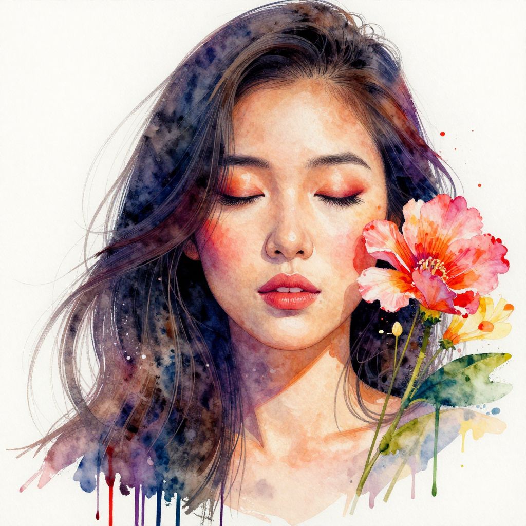 A vibrant watercolor painting of an Asian woman with closed eyes, expressive long hair, and flowers near her face, featuring dripping paint and a colorful, detailed, full-frame artwork.