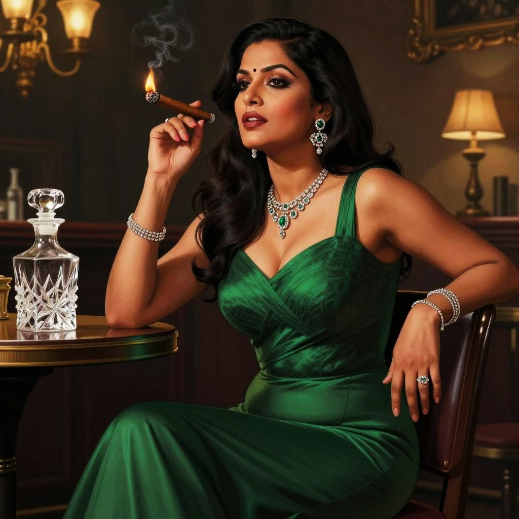 Highly detailed scene in the style of Greg Capullo, showing charismatic South Asian woman in her early 40s in an emerald green evening gown, sitting at a pub with crystal decanter and a lit cigar, low angle dramatic shot, hyper-detailed and elegant, cinematic pub ambiance.