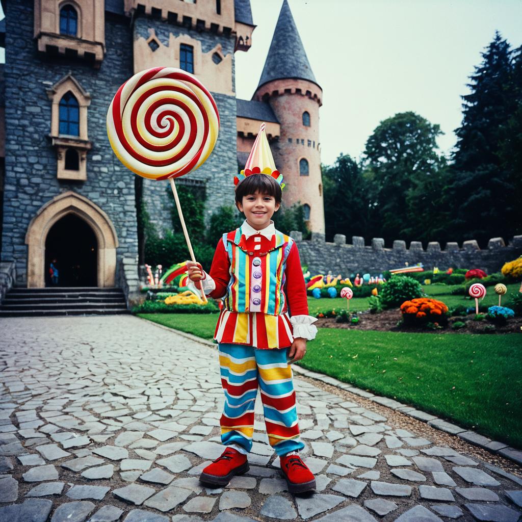 Candyland Costume For Boy, child in a colorful outfit standing in front of a castle