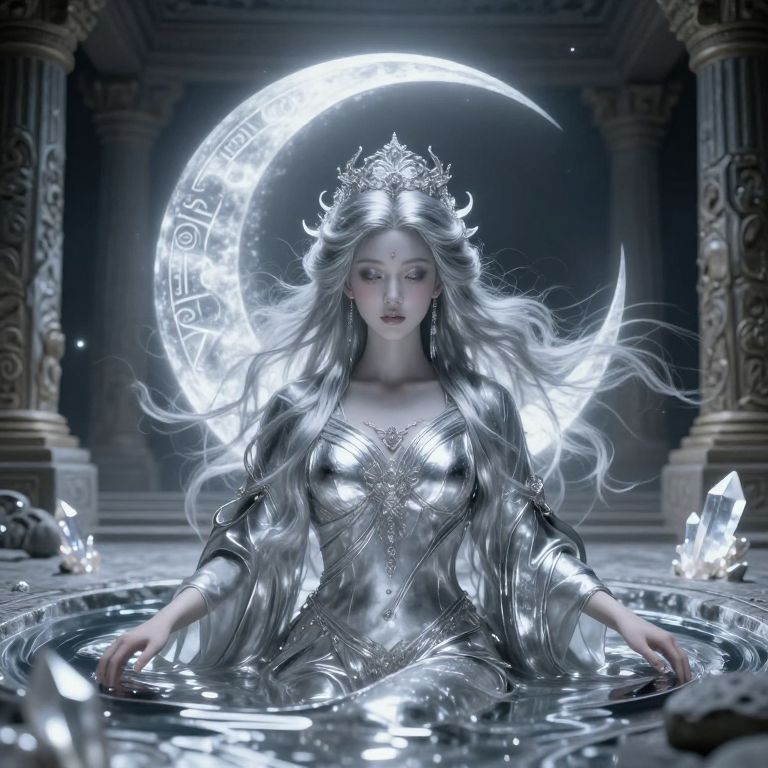 A mysterious silver moon goddess emerging from a pool of liquid silver on an ancient lunar temple floor, her face perfectly symmetrical with serene beauty, pale skin glowing faintly under the celestial light, her hair flowing like moonlight, her entire form illuminated by a soft, pulsating mystical shine, surrounded by floating lunar crystals and glowing runes that swirl in harmony with the moon's rhythm.