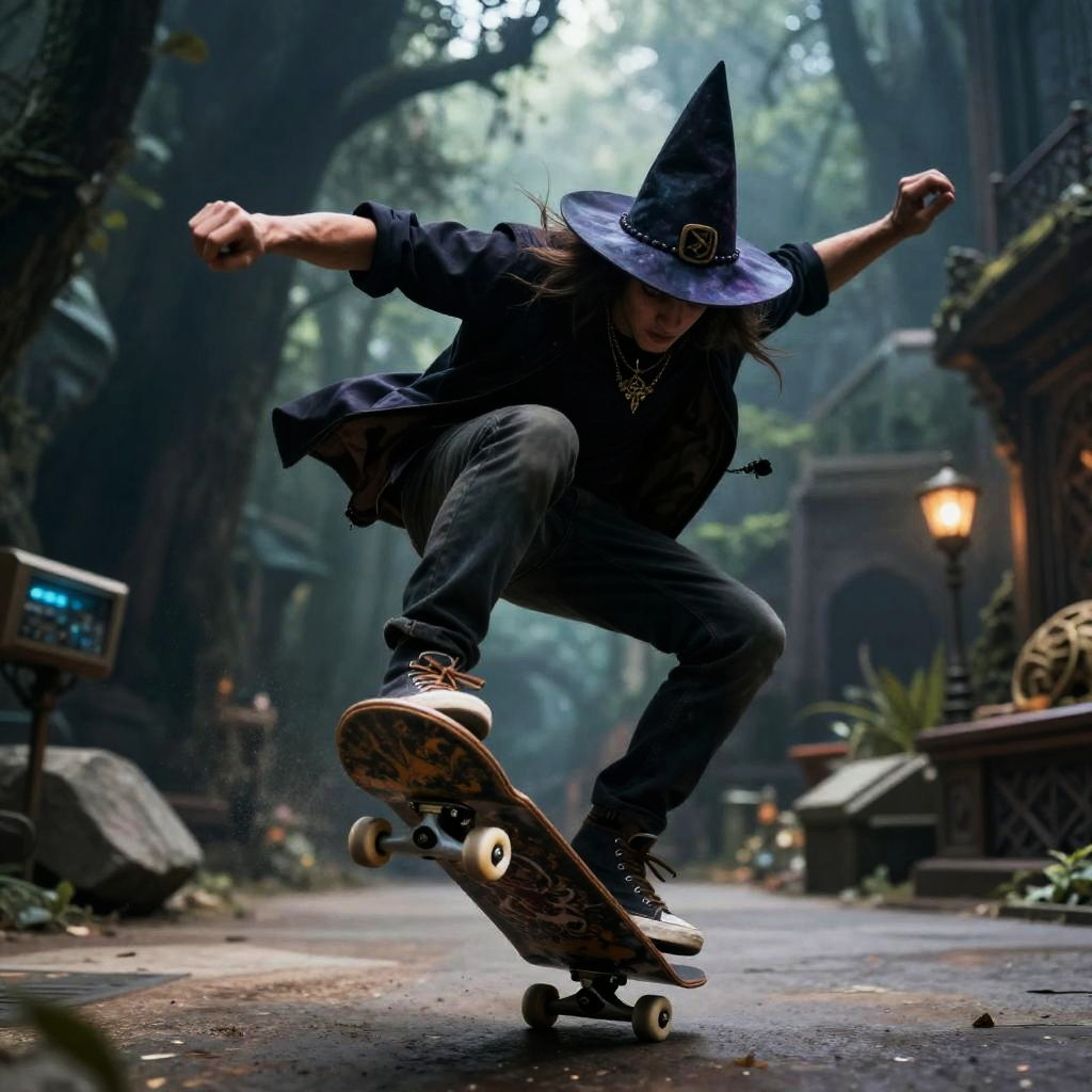 Realistic photo.Fantasy skateboard tricks with wizardry, enchanting, bold and spellbinding action-packed adventure, mysterious and artistic style. realistic photo