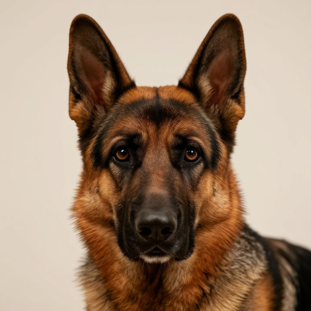 Close-up portrait of a British German Shepherd with expressive eyes, sharp ears standing up, textured fur highlighted by soft studio lighting, neutral background to emphasize facial features, hyper-realistic rendering, warm tones.