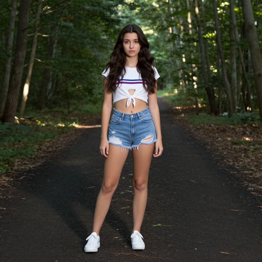 Photograph of a young woman with long, wavy dark brown hair standing confidently on a dark forest path. She's wearing a white, tied-up, cut-out crop top with blue and red stripes, and high-waisted, ripped blue denim shorts. She completes the look with white sneakers. The background shows a sunlit forest with tall trees and a dirt path, creating a serene, natural setting.