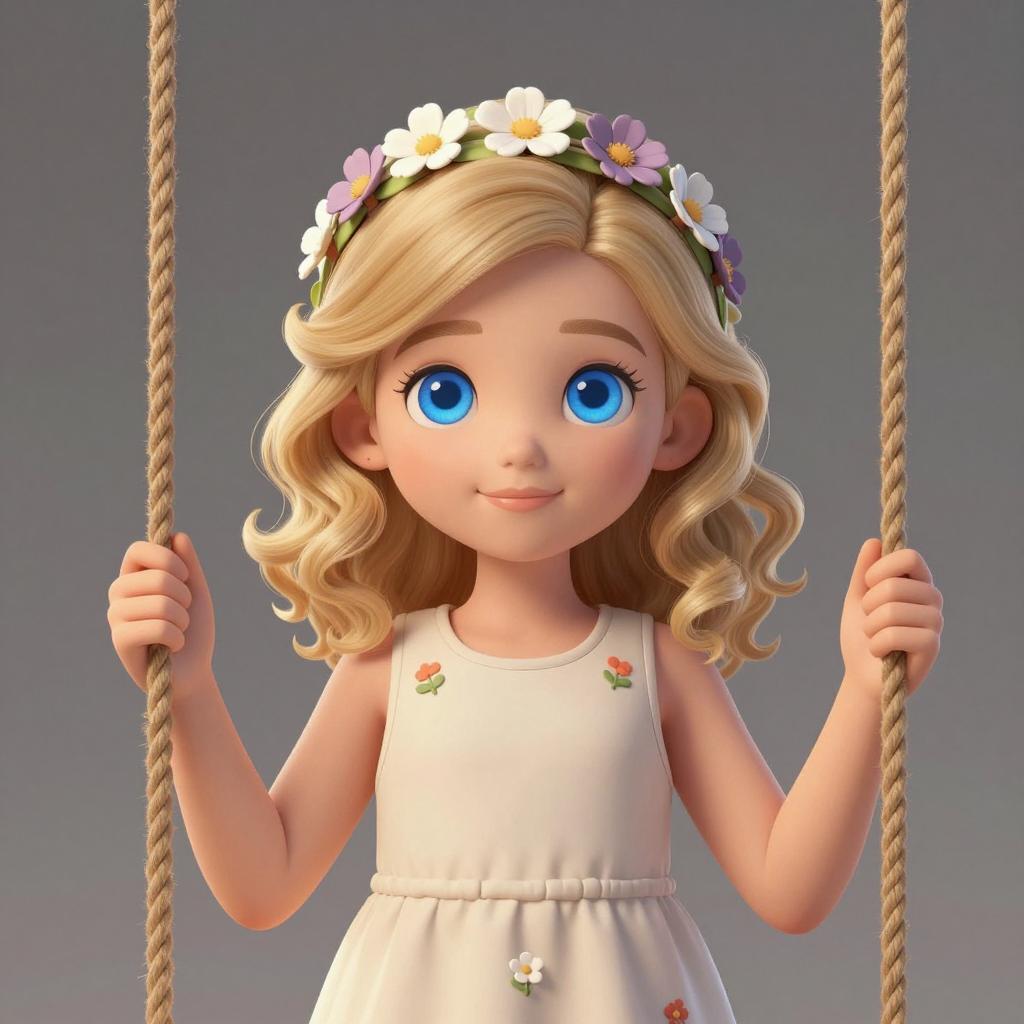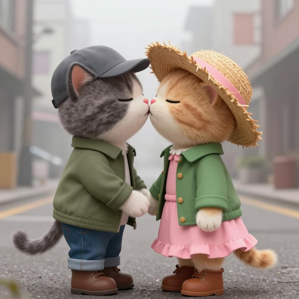 Digital illustration of two children standing close together. The boy on the left has spiky blonde hair, blue overalls with patches, a white shirt, and pink sneakers. The girl on the right has a pink headband, blonde hair in a ponytail, pink overalls, a white shirt with a heart, and pink sneakers. She holds a pink flower and looks at the boy with a slight smile. Both have blue eyes and rosy cheeks. Background is a blurred, warm-toned outdoor setting. Both children have hands in pockets.