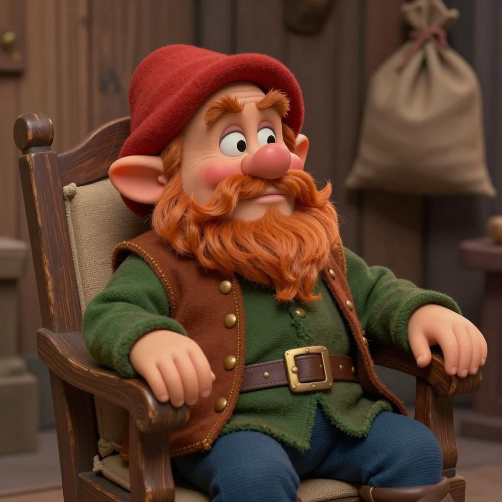 Disney adult sleepy dwarf, photorealistic, old man with long orange beard, wearing medieval clothing, red hat, green shirt, brown vest, blue pants, sitting on wooden chair with beige cushions, background of wooden wall and sack, serious expression, realistic ures, warm lighting, slightly exaggerated features, detailed beard, fantasy character, adventure attire, medieval fantasy setting