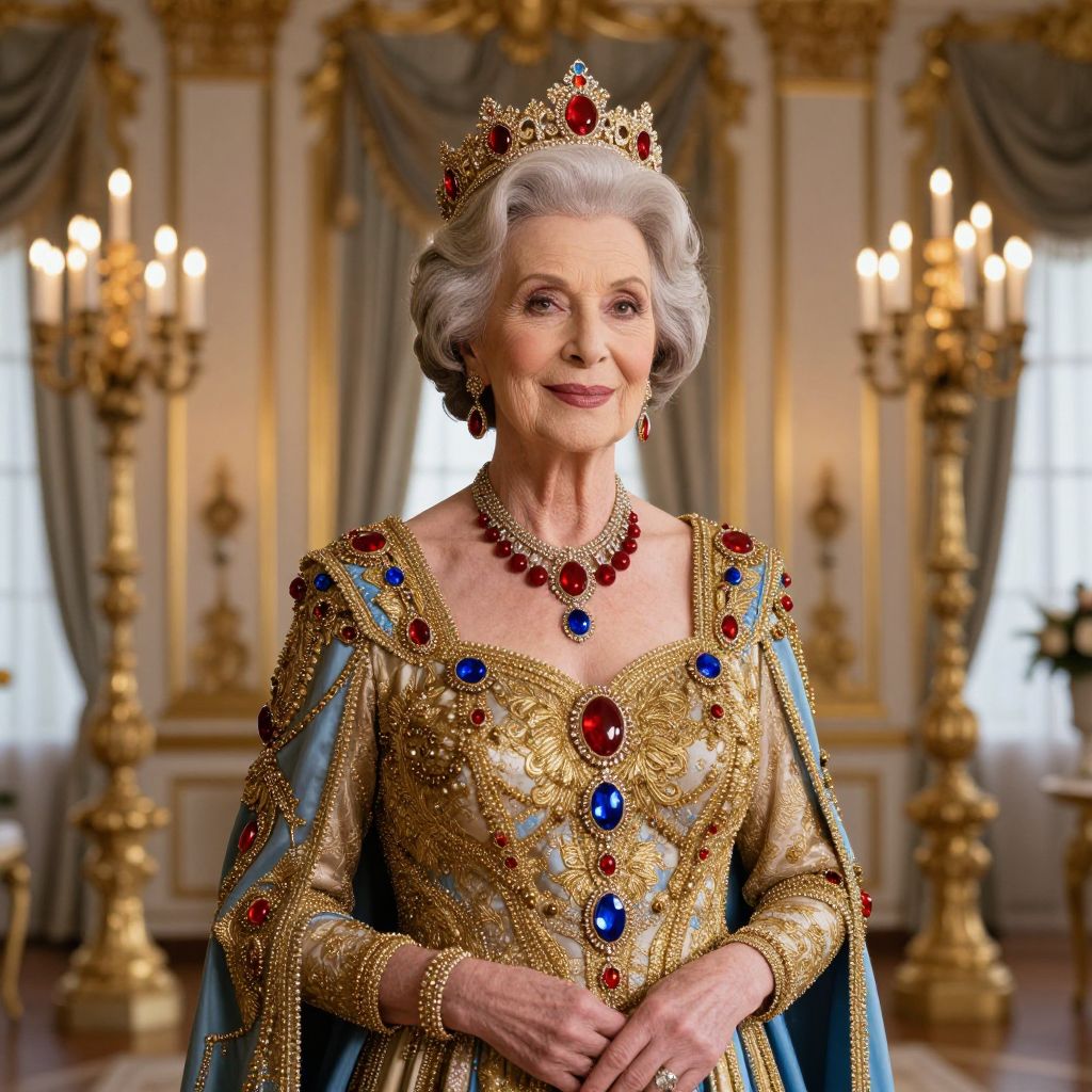 A photograph of an elegant elderly woman with short, gray hair, wearing a stunning, ornate gold and blue gown adorned with red and blue gemstones. She has a regal crown on her head and matching jewelry. The background shows a luxurious, gold-decorated room with tall, lit candelabras and draped windows. She has a warm smile and a confident demeanor.