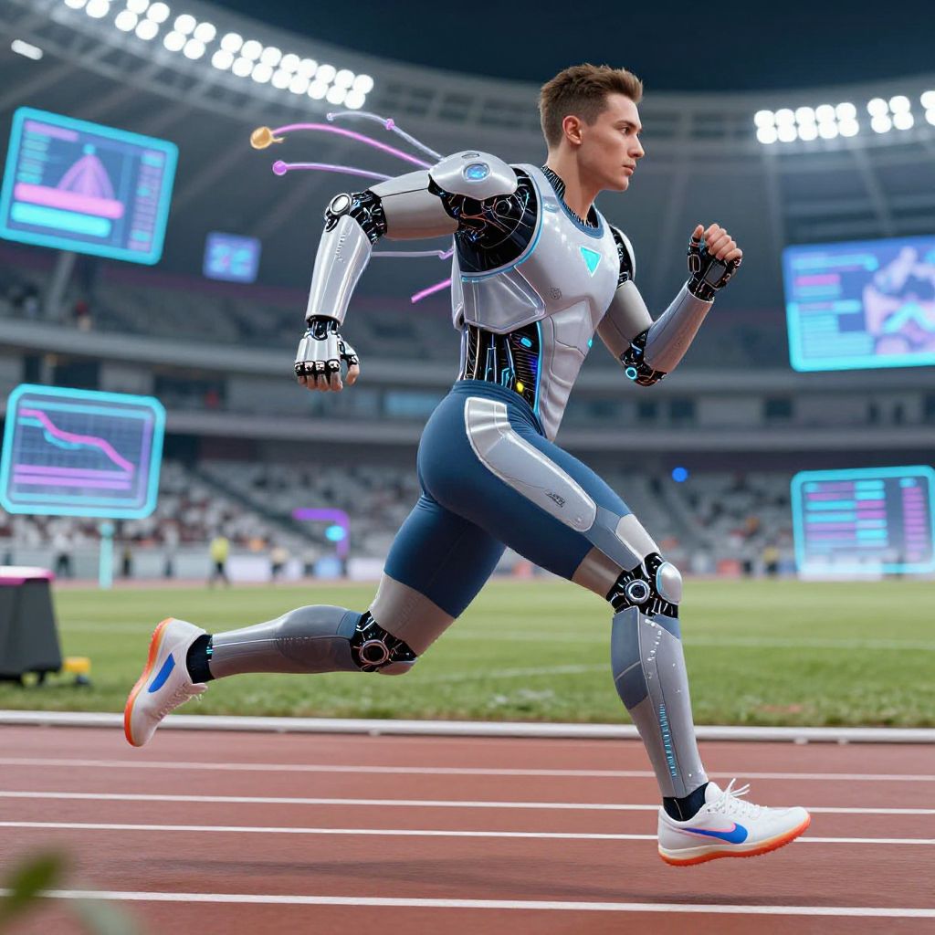 Photorealistic CGI image of a male athlete with robotic limbs and joints, running on a track in a stadium. He wears a form-fitting, futuristic sports suit with blue, white, and silver accents, and white sneakers with blue and orange soles. His robotic arms and legs feature intricate, black circuitry patterns. The stadium is brightly lit with large screens displaying purple and blue graphics in the background. The track is red with white lines, and the grassy field is visible beyond the track. The athlete's expression is focused and determined, with short brown hair.