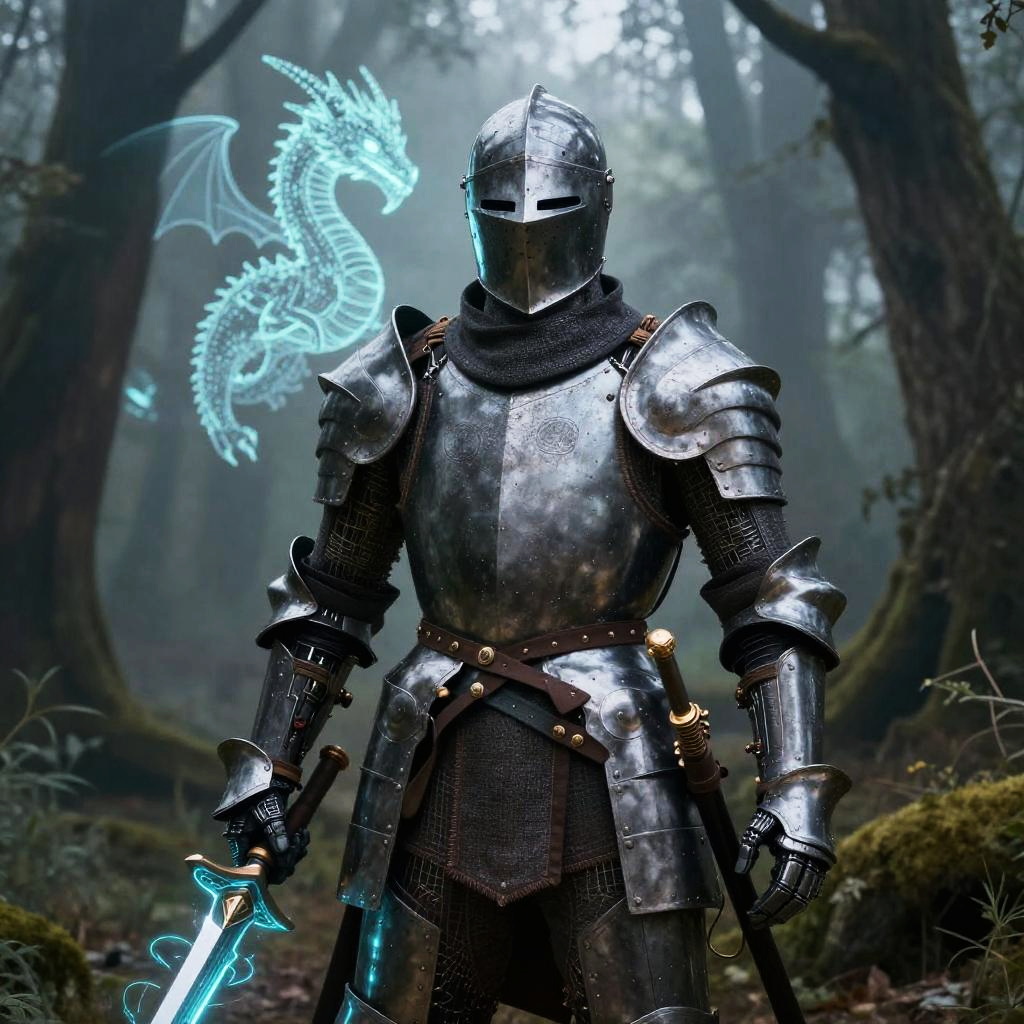 Medieval ai art featuring a knight in shining armor enhanced with cybernetic implants and holographic weapons, standing in a foggy forest with a glowing AI dragon in the background, atmospheric lighting, rich textures, epic fantasy setting