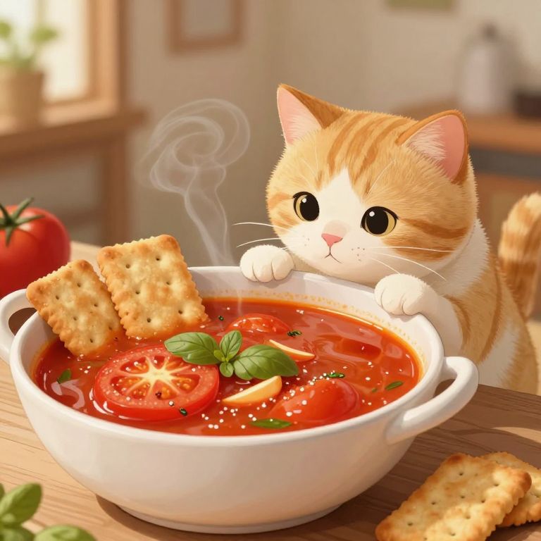 A whimsical kitten emerges from a nest of spaghetti, nestled serenely within a vibrant sea of tomato sauce dotted with cheerful maus cracker islands, creating a surreal and enchanting tableau.