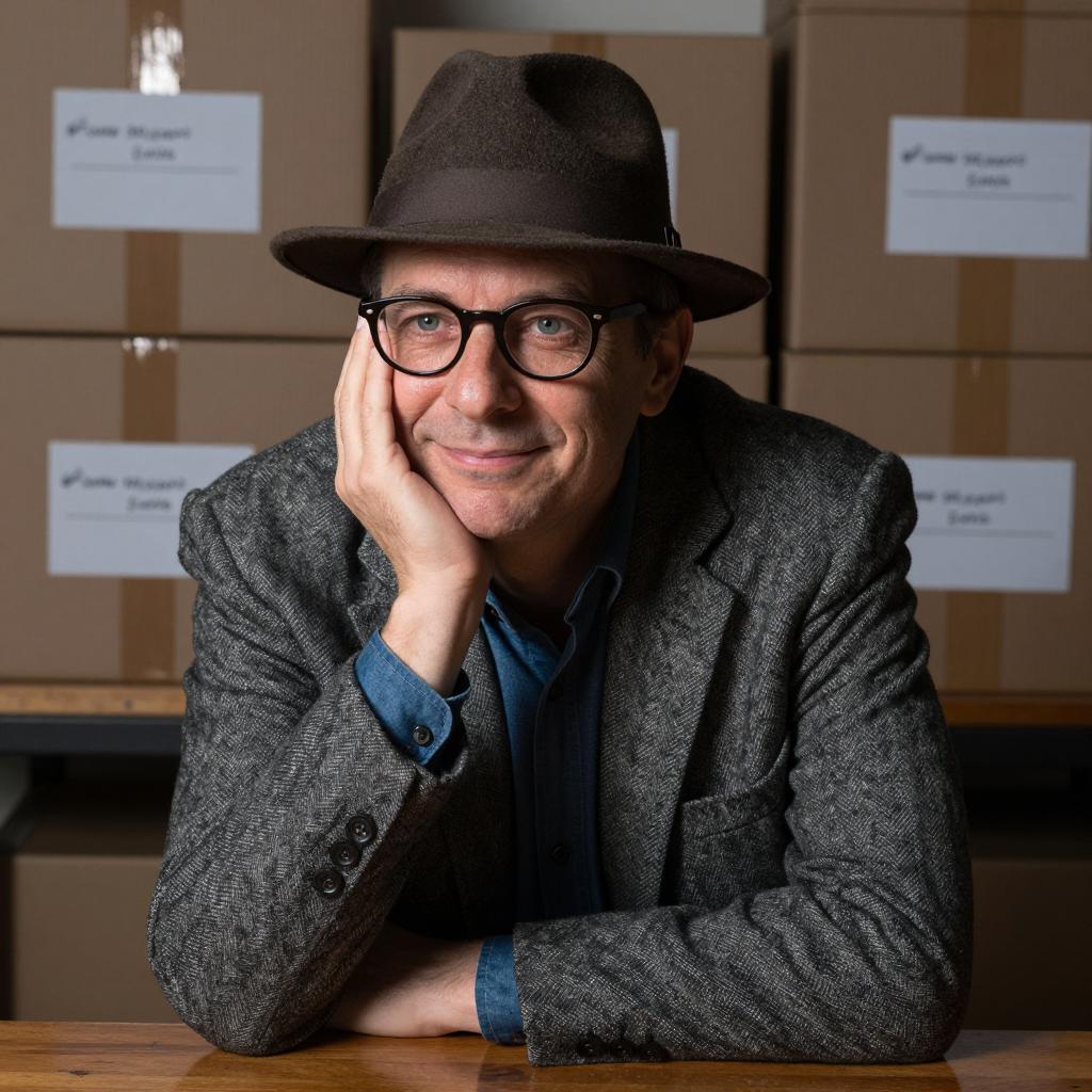 Man with glasses and dark brown fedora, wearing a gray tweed blazer over a blue shirt, sitting at a wooden table. He rests his head on his hand, smiling slightly. Several stacked cardboard boxes with handwritten labels are in the background. The lighting is dim, highlighting the man's face.