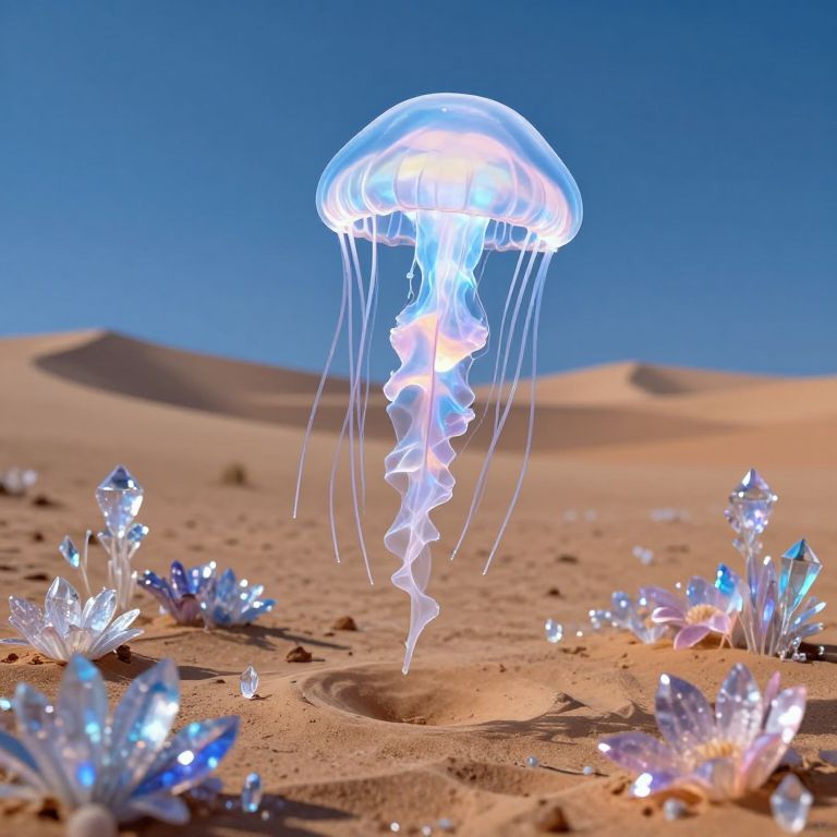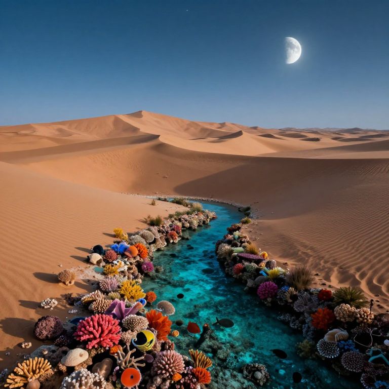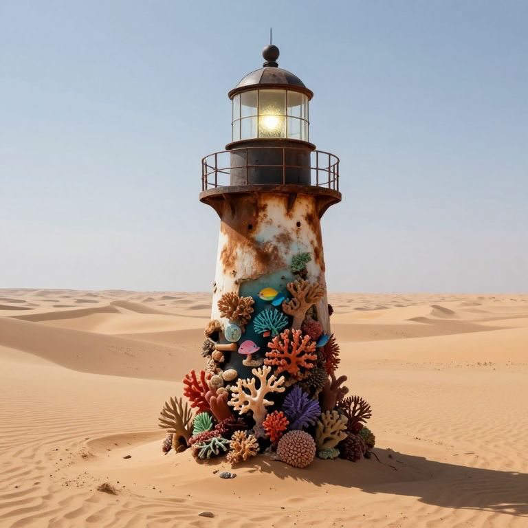 A surreal digital artwork portrays an exuberant coral reef thriving within the confines of a weathered iron beacon on the precipice of an unending desert expanse. From a low vantage point, viewers are immersed in the juxtaposition of vivid marine life against the barren terrain, sparking awe and inquiry. The lighthouse's illuminated interior casts striking shadows upon the sandy dunes outside, intensifying the vibrant hues of corals and fish against their stark backdrop. This harmonious blend of nature's abundance within an unlikely haven underscores the tenacity and versatility of life, challenging observers to reflect on the intricate web that connects all living beings amidst the harshest facets of existence.