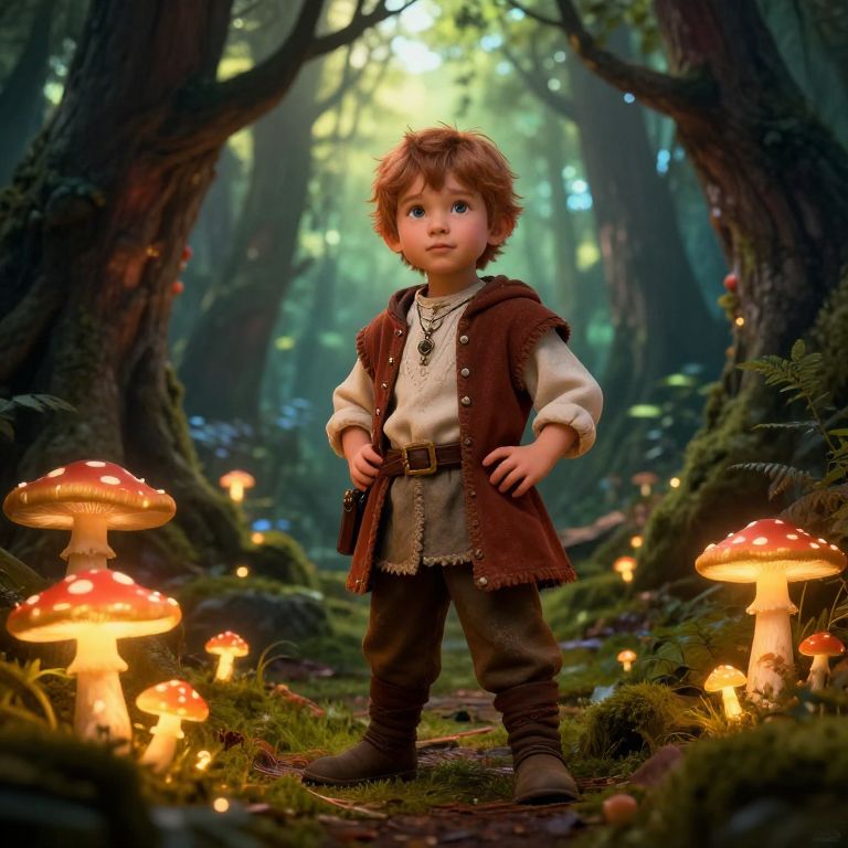 Explore a dense, magical forest with a glowing map to navagate the winding paths, mythical creatures peeking through the mist, bioluminescent plants illuminating the scene, a young adventurer in rustic gear focused on the map, detailed fantasy art.