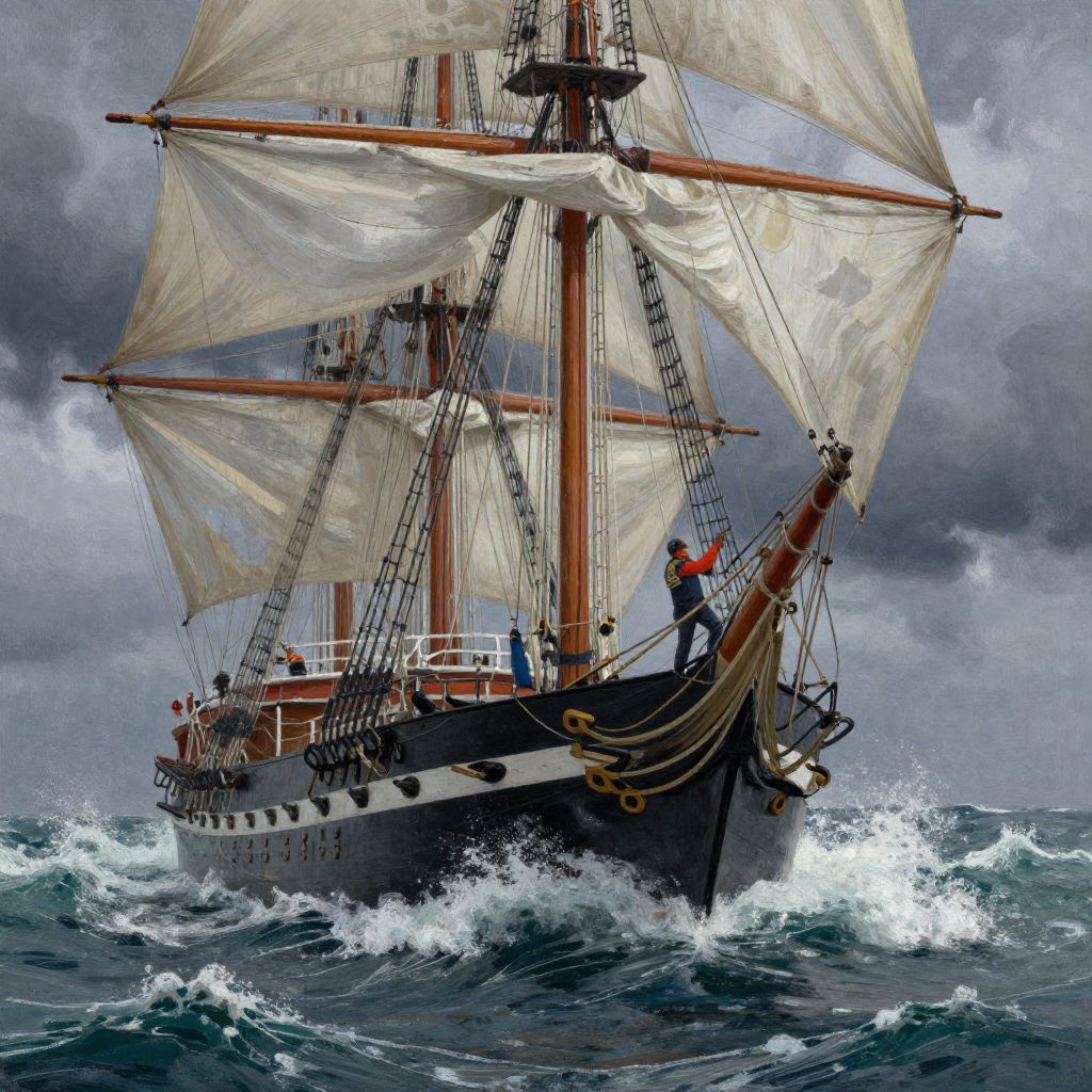 Seaman repairing the rigging on tall masts of a historic sailing ship amidst stormy seas, dramatic dark clouds and crashing waves, energetic brush strokes with a painterly maritime art style.