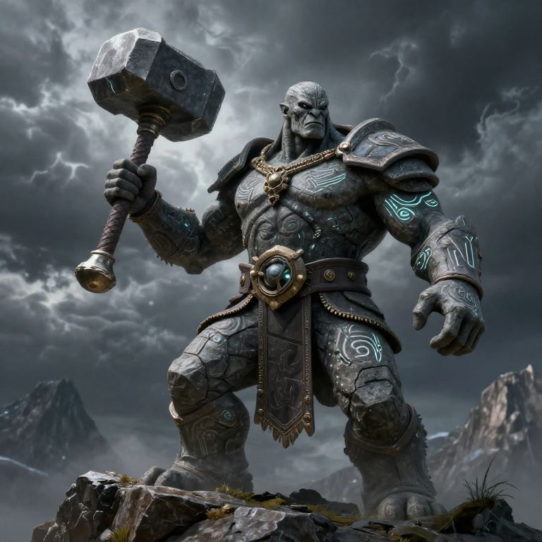 Digital artwork of a muscular, stone-skinned warrior with glowing blue runes, wielding a large hammer, standing on a rocky mountain under stormy skies.
